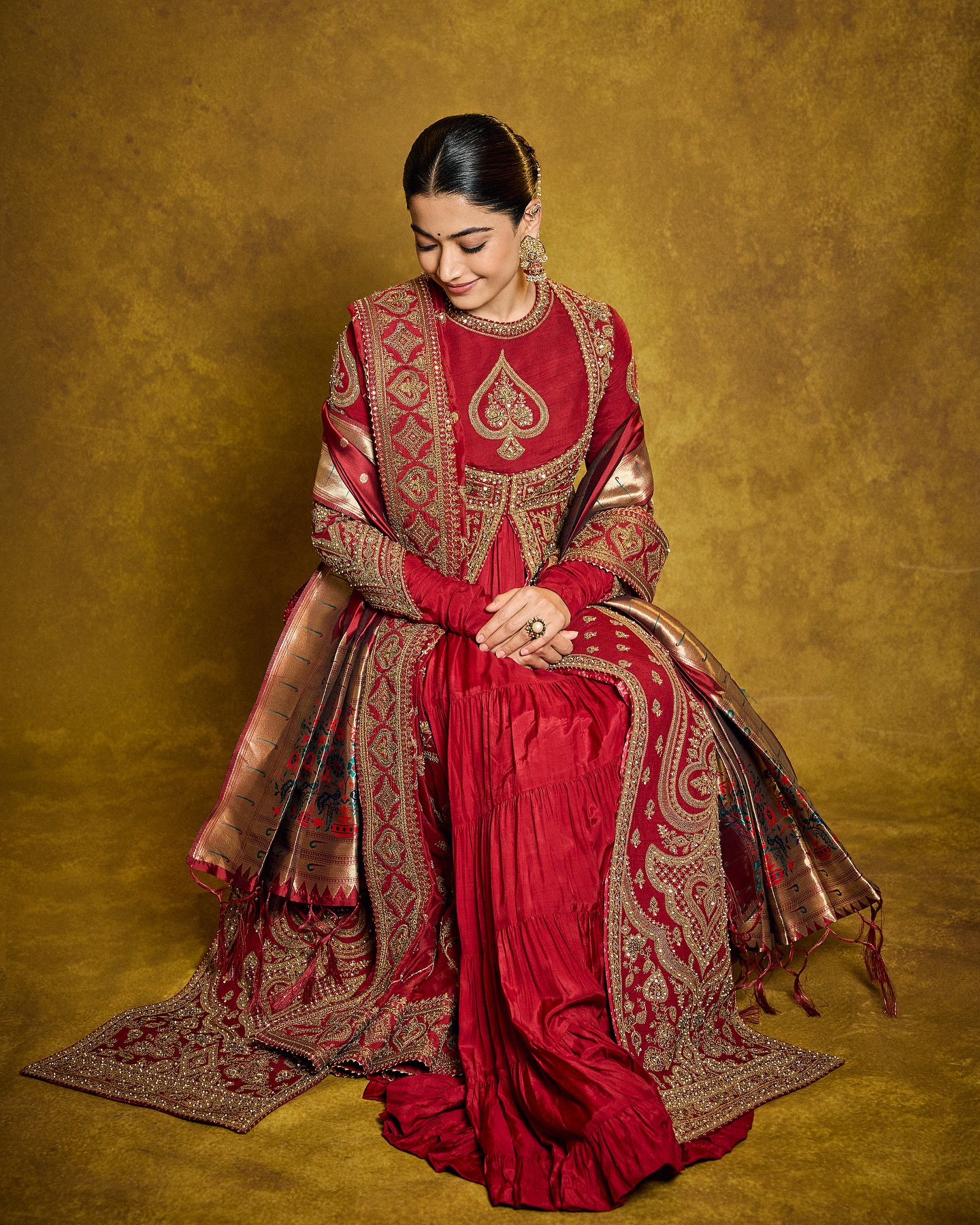 For the occasion, rashmika opted to don a heavily embroidered, deep-red kurta set from the popular indian designer brand Torani. With its lavish gold threadwork, intricate zardozi work, and finely woven paisley patterns, the outfit was the epitome of elegance. The outfit has a vintage regal vibe thanks to the large heart-shaped jaal embroidery on the chest of the full-sleeved, high-necked kurta.