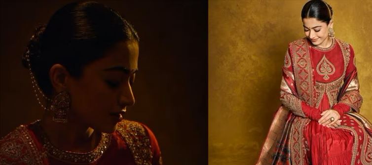 Rashmika let her costume take center stage by wearing simple yet eye-catching accessories. She added a hint of royal elegance by accessorizing traditional gold jhumkas with elaborate craftsmanship. Her exquisite ring on her fingers discreetly enhanced the whole ensemble without drawing too much attention to itself.