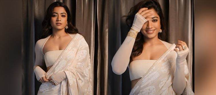With one side of the saree attached to the blouse and the other dropping on her arms, rashmika skillfully draped the saree around her body, exposing the pleats at her waist and holding the pallu on her shoulder. She looked stunning thanks to the intricate lace accents that graced the saree's border.
