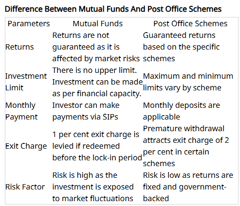 Your financial objectives will determine which option is best for you. Mutual funds and post office schemes have various functions. Examine your requirements, risk tolerance, and long-term financial goals before selecting an investing strategy.
