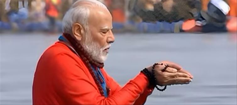 During his wednesday visit to Prayagraj, Uttar Pradesh, for the Mahakumbh Mela, prime minister Narendra Modi took a sacred plunge in the Triveni Sangam. The prime minister stood in the river and offered prayers while holding 'rudraksha' beads and reciting mantras.