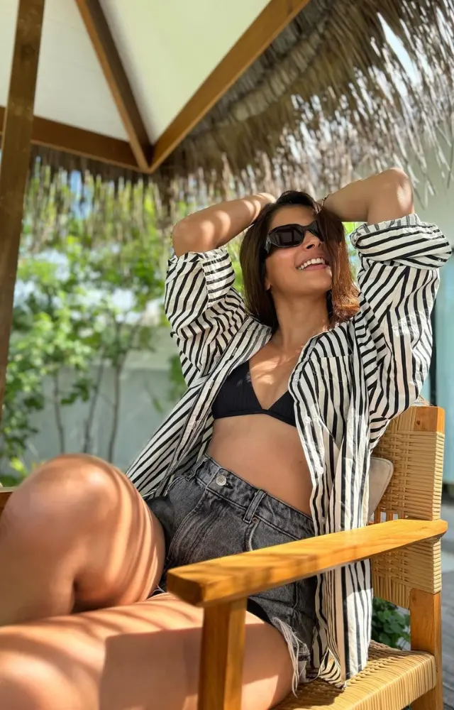 During this vacation, she also showed off her love of stripes. She accessorized the ensemble with a striped blouse wrapped around her waist and a pretty white bikini.