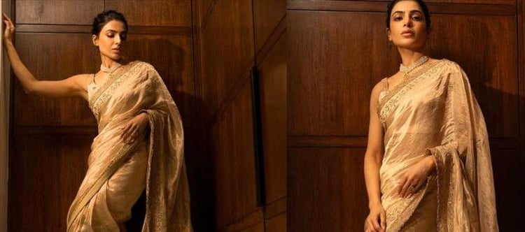 Samantha Ruth Prabhu was seen a few weeks ago wearing a multicolored patchwork tissue sari from a business based in New Delhi. She recently wore a golden zari tissue design to celebrate her fifteen years in the film industry in Chennai, choosing the label once more.