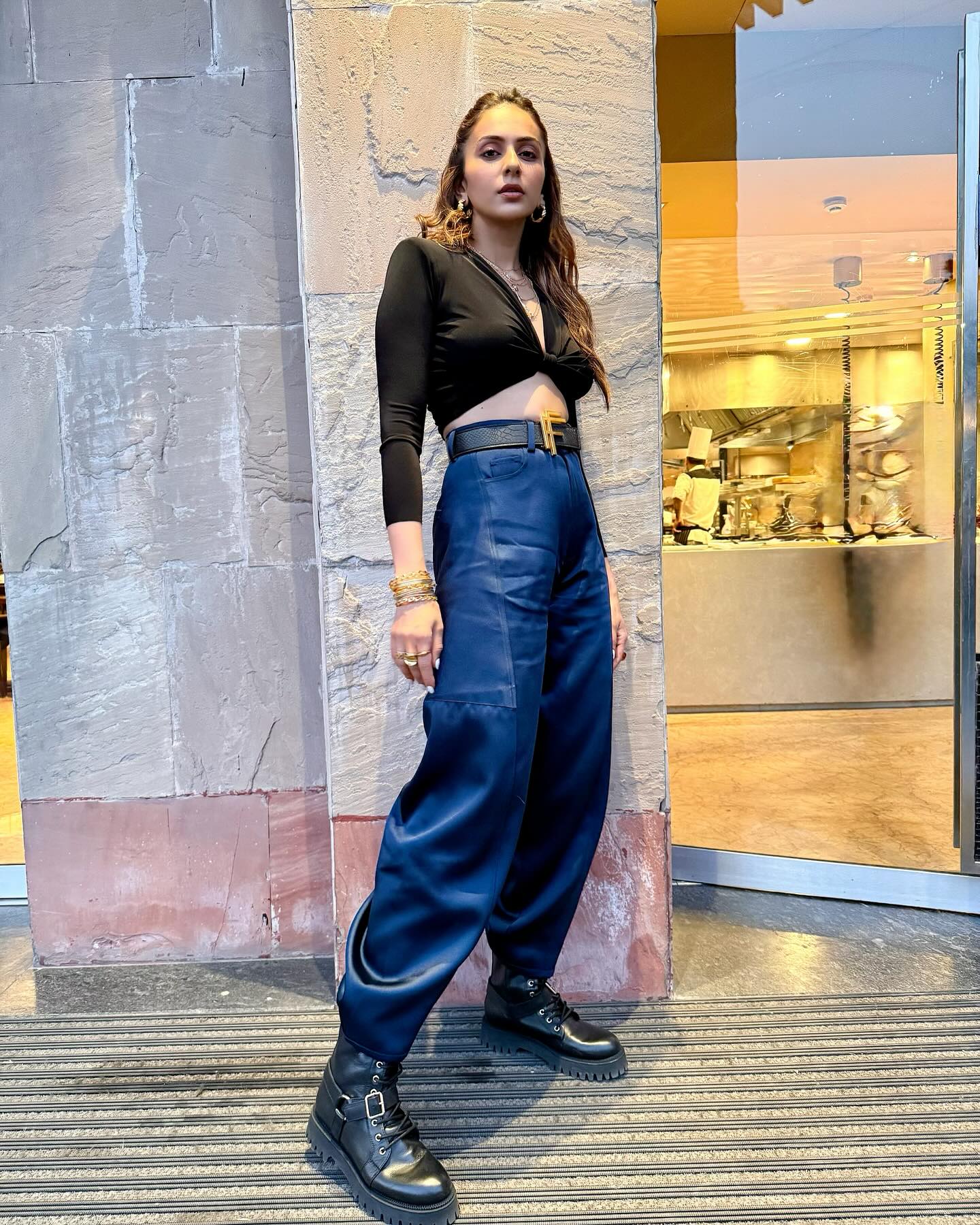 rakul preet singh was the perfect example of street style's daring, rebellious cousin! The actress, sporting a strong yet effortlessly cool tomboy look, was recently sighted in Bombay. She wore bell-bottom blue slacks and a black crop top, and she accessorized with bold boots. But what really got