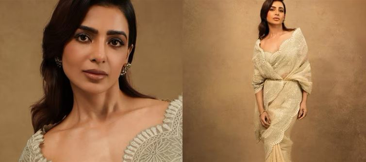 samantha Ruth Prabhu attracted attention at a recent event by wearing a stunning ivory saree from Kresha Bajaj's collection. A striking golden belt held the front-draped pallu of the saree, which was styled with a contemporary twist. The outfit, which was adorned with exquisite silver and white sequins, was the ideal fusion of sophistication and modern style.Samantha accessorized her ensemble with a pair of sophisticated golden drop earrings set with pearls and white stones. She added a sense of refinement with her elegant, one-sided open hairstyle. The actress chose warm brown eyeshadow, well-defined eyebrows, and smoky eyes as part of her bold, glitzy beauty look. Her base had a delicate, dewy sheen, and a rich, glossy lip color looked a crisp, eye-catching finish.