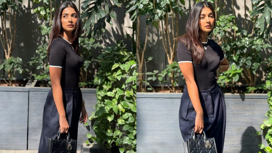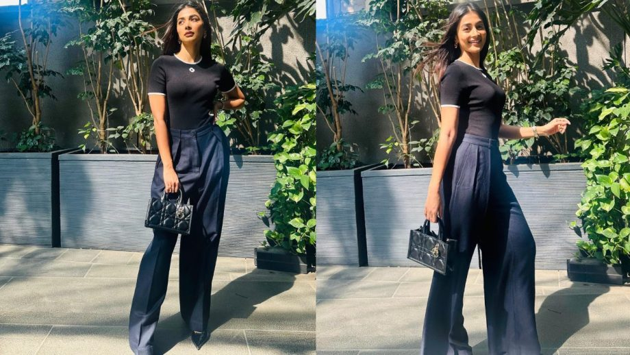 Pooja easily spreads her charm in this dress that isn't all that casual. She accessorized a matte black flared formal bottom with a black high-neck shirt with a white border, creating a stylish ensemble that accentuates her tall stature. She sported a statement handbag, toe-point heels, a little natural makeup, and golden accessories to accentuate her simple look.