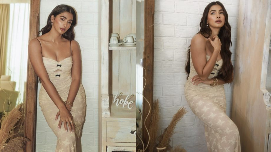 Mini dresses are always a good choice, and pooja looked great in a beautiful red bodycon minidress that accentuated her long, toned legs. Her slender form gave her supermodel vibes, and the off-the-shoulder sleeves with halter neck strappy sleeves highlighted her gorgeous shoulders. She exuded confidence and charisma thanks to her open haircut, shiny lips, and dewy cheeks.