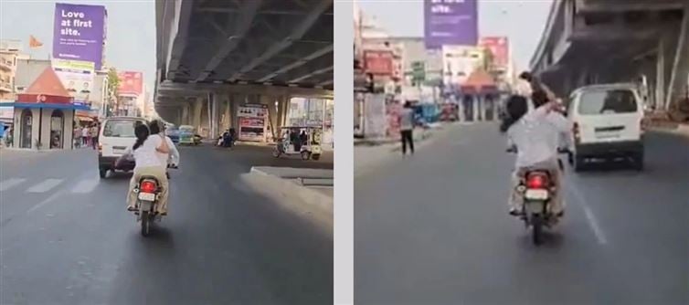 As the bike keeps moving, the woman begins hitting him from all sides, the front, and everywhere else, which rapidly intensifies the situation. The fact that neither of them is wearing a helmet adds to their carelessness.