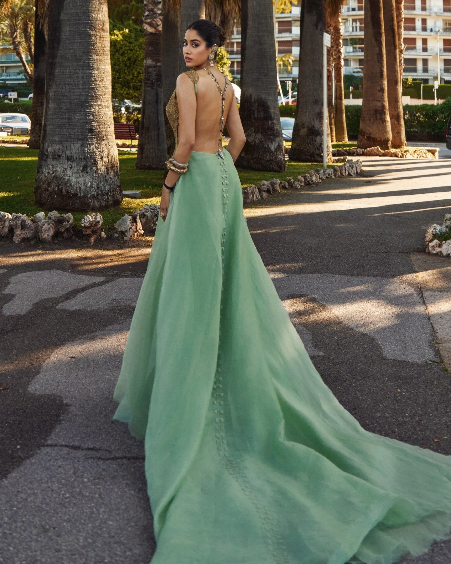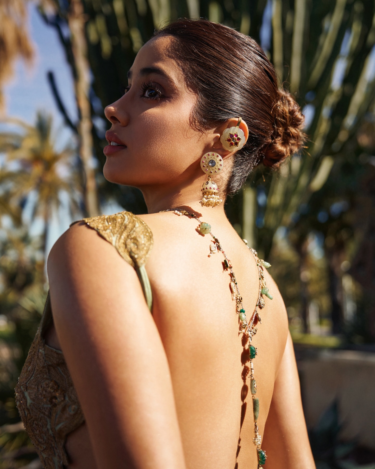 air with its intricate golden embroidery and corseted bodice, highlighting Janhvi’s statuesque poise. But it was the open back—secured only by a delicate chain of tiny charms and pearls—that made this look unforgettable.