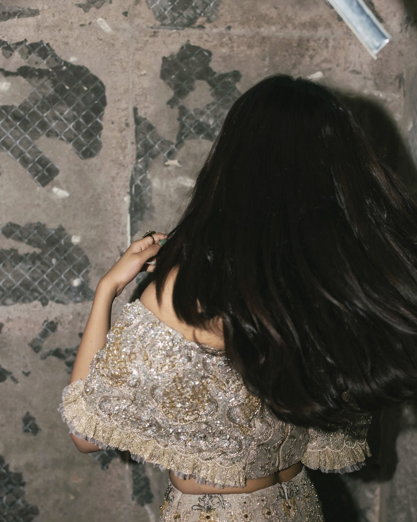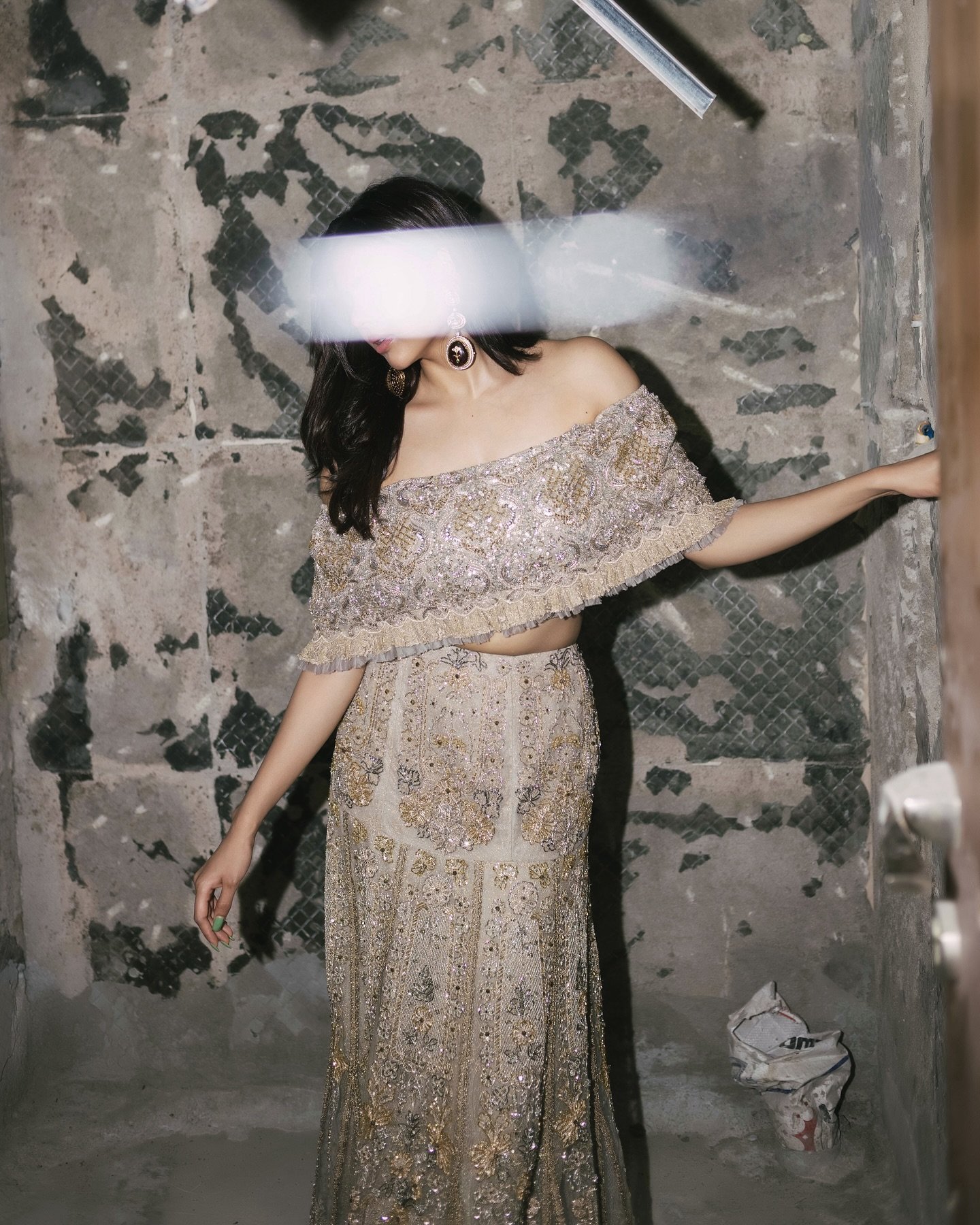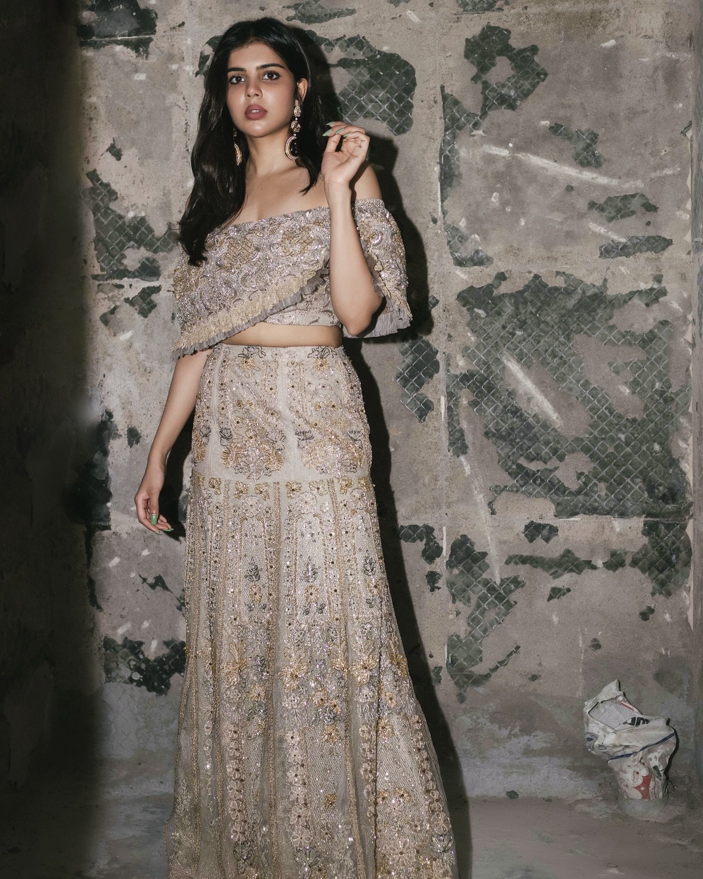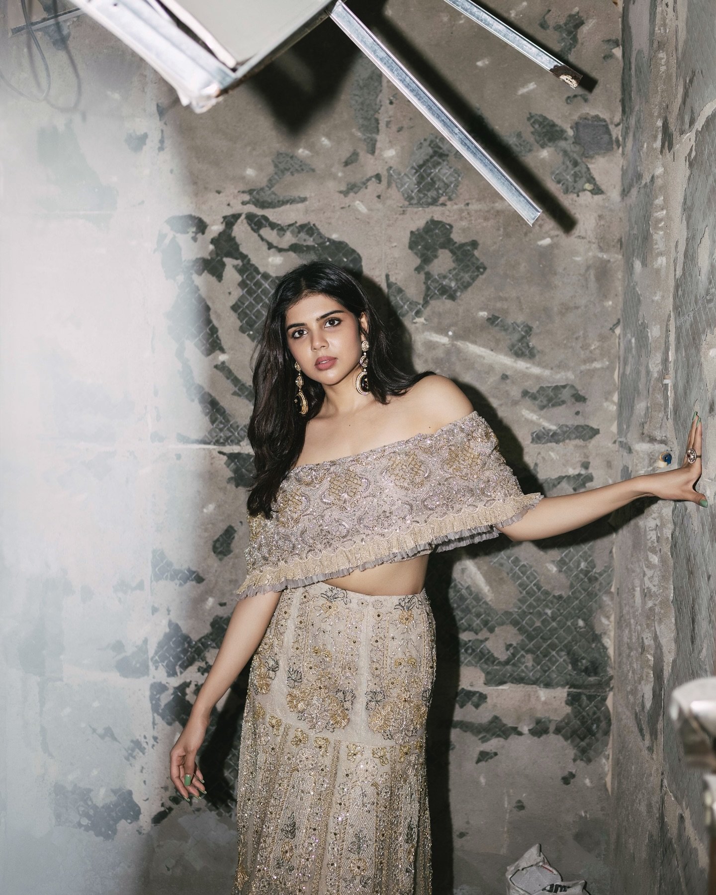 What makes the shoot particularly striking is the unpolished, almost chaotic setting—a storeroom that appears messy and random at first glance. Yet, rather than detracting from the visuals, the backdrop only enhances the contrast, letting Kalyani’s confidence and the outfit’s bold color dominate the frame.