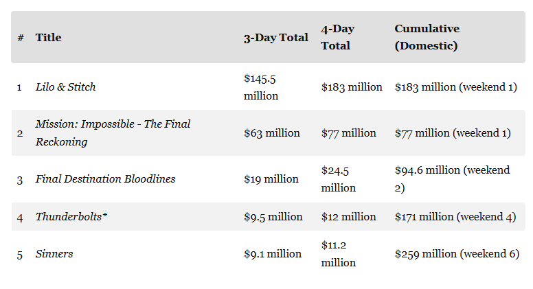 Lilo & Stitch is expected to surpass the domestic run of the original film, which brought in $145.8 million in North America, by the end of Monday.  With $24.8 million, Mission: Impossible - The Final Reckoning achieved the best opening day in the eight-film series and is still on course to surpass Mission: Impossible - Fallout's $61 million three-day debut to set a new franchise record for the best opening weekend.