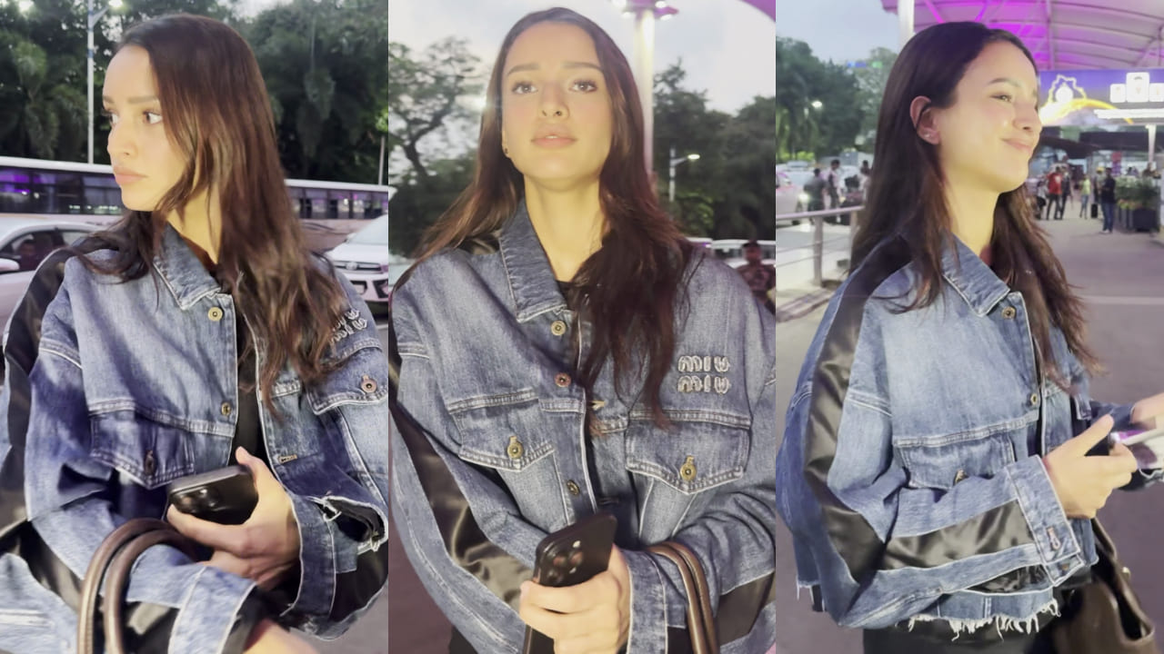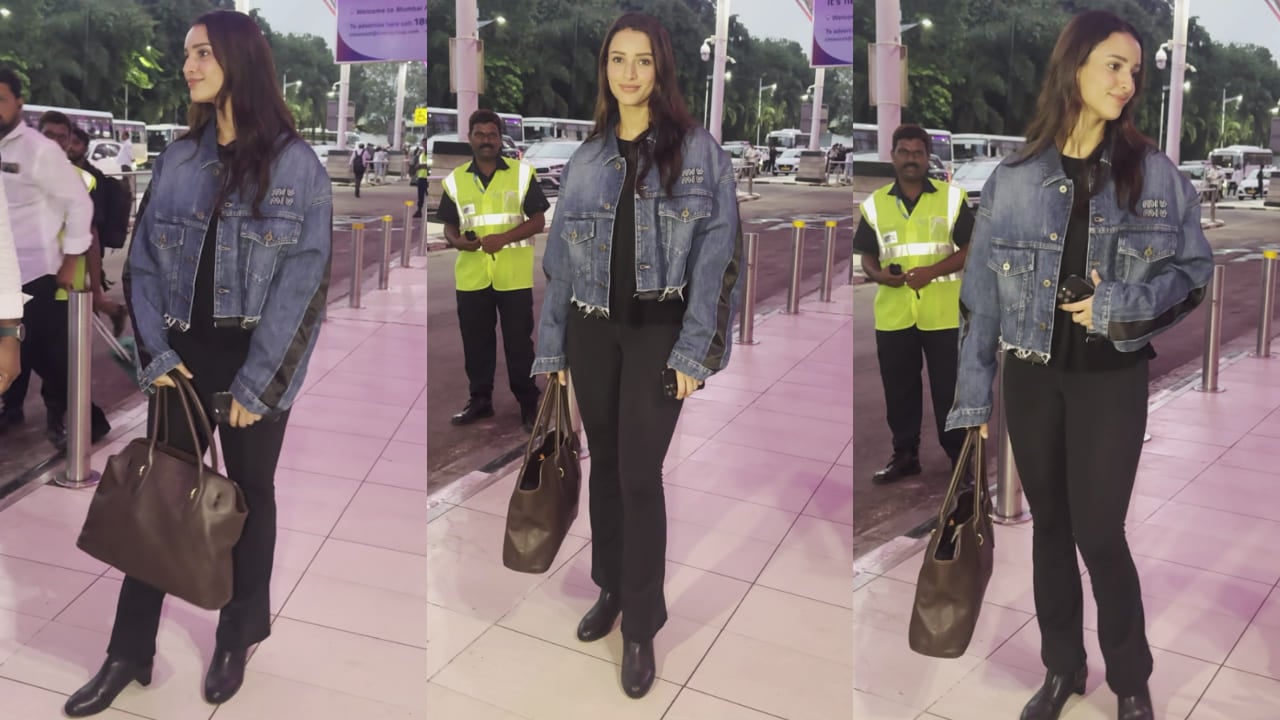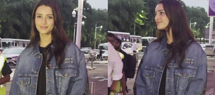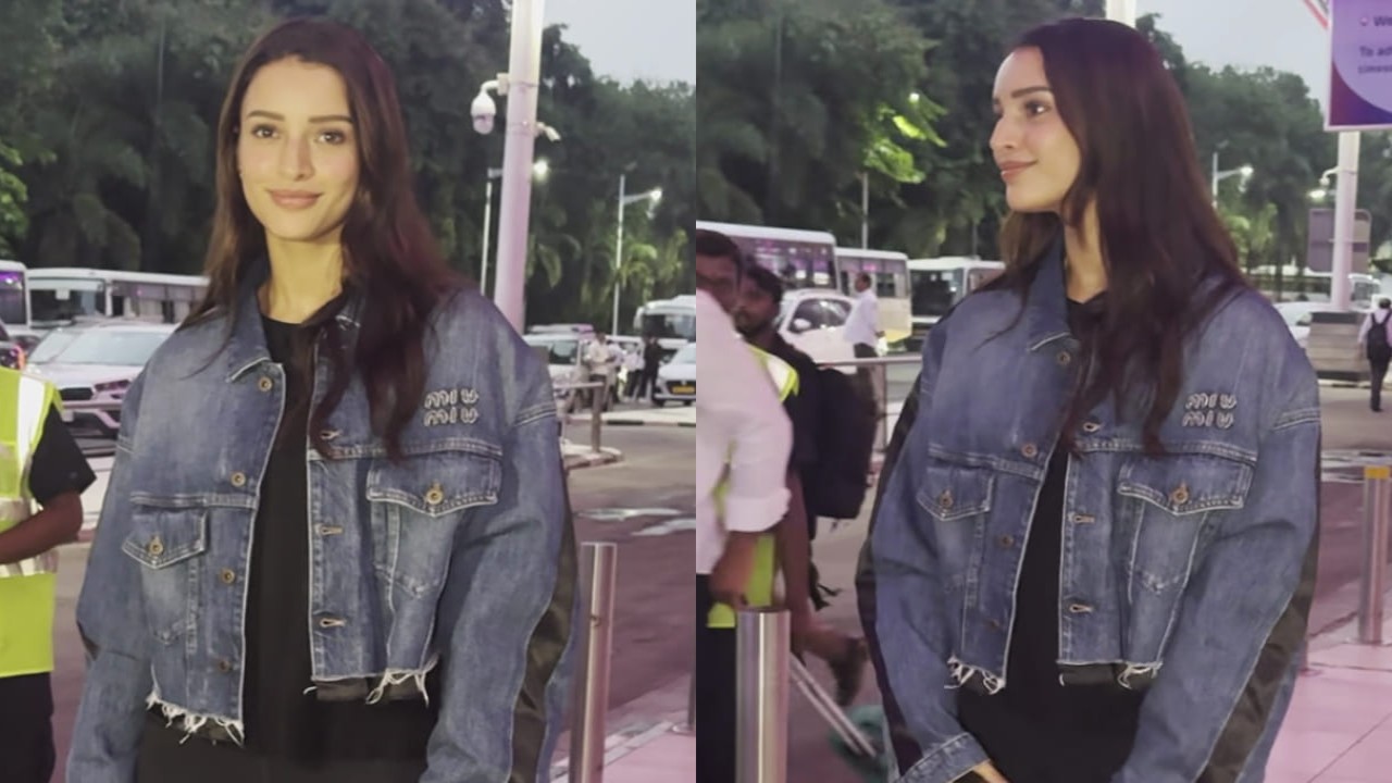 airport wearing a couple of Miu Miu pieces with an easygoing vibe. The actress wore a Miu Miu dual-toned denim jacket over a simple black shirt. The jacket's black and navy blue hues went well with Triptii's top. Her layering radiated biker-girl energy, with pockets on either side and a cut, rugged hemline. Additionally, the brand's emblem was embroidered with white threadwork on the right side of the garment.