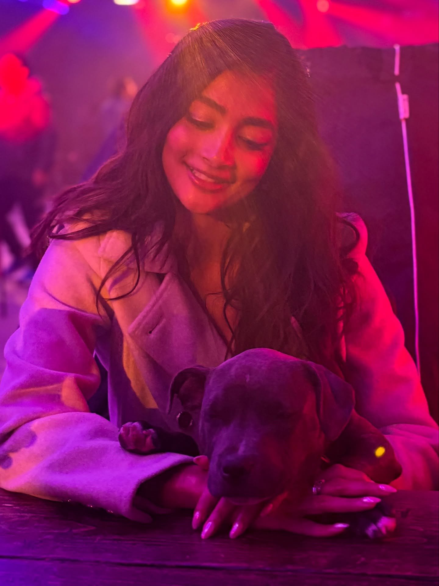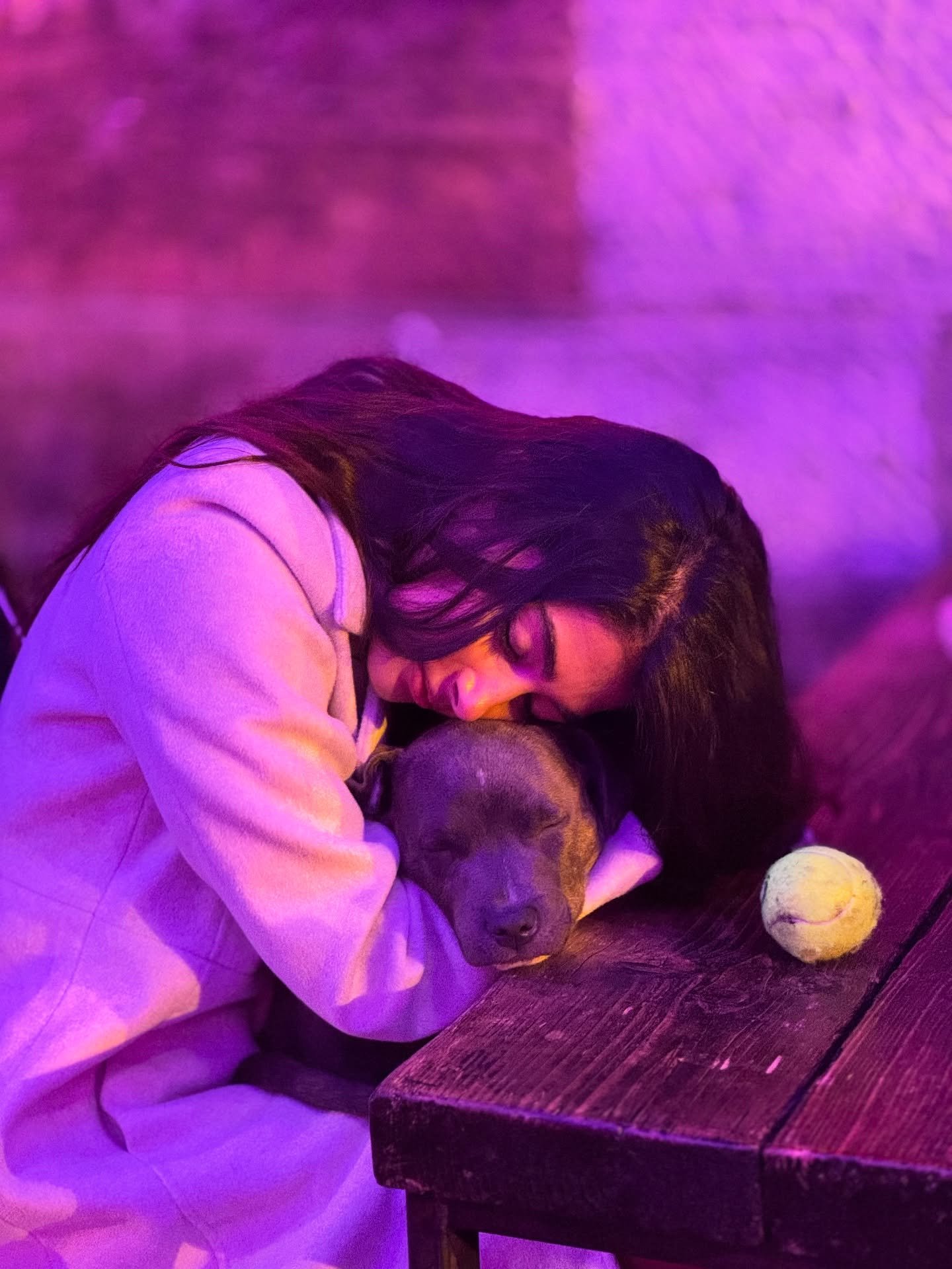 pooja crouched down, cuddling the furry companion, who seems equally thrilled by the affection. Her radiant smile and the gentle way she interacted with the dog were quick to win over fans online, with many praising her down-to-earth nature and kind heart.