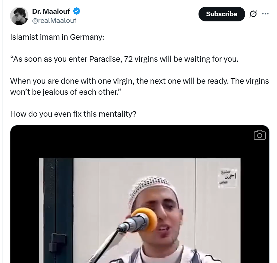 Statements like those allegedly made by an Islamist imam in Germany—promising sexual rewards in the afterlife—reflect a deeply distorted and literalist interpretation of religious texts that is often used to radicalize or manipulate followers. These views are not representative of mainstream Islamic theology but are instead pushed by fringe elements who exploit