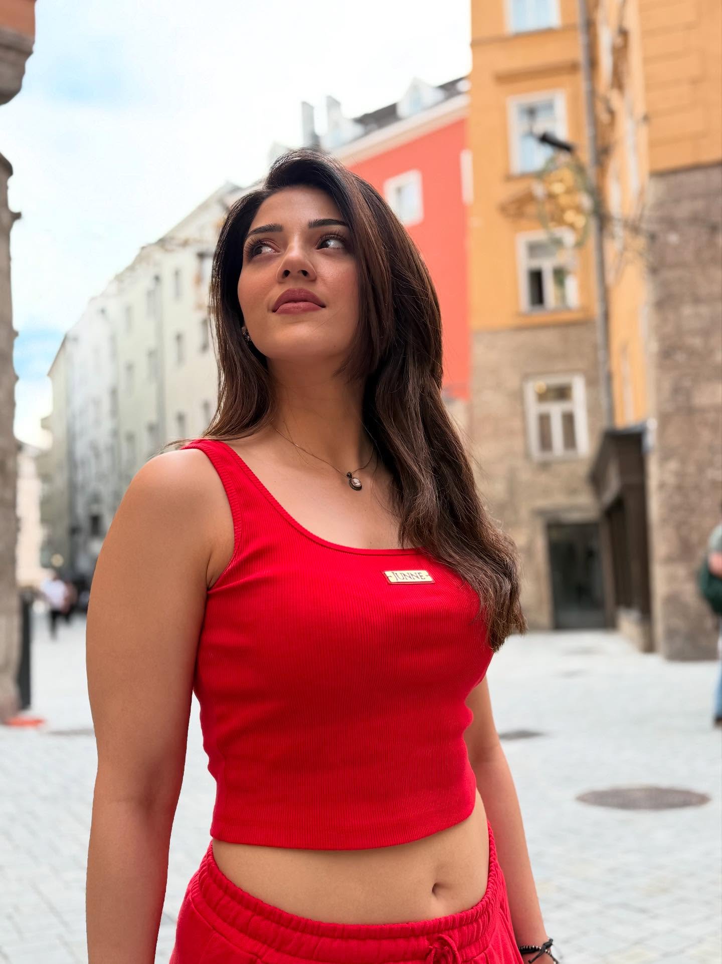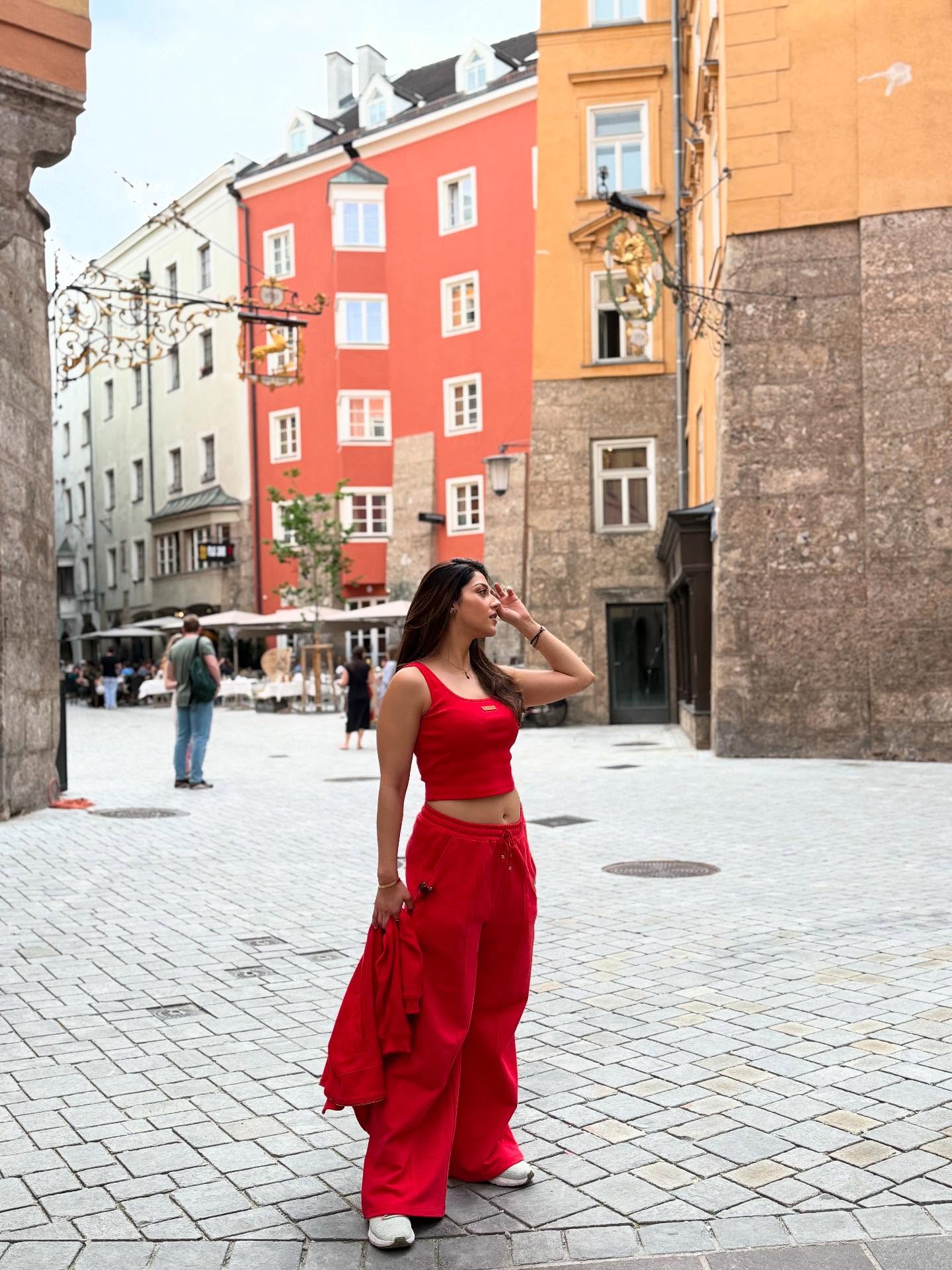 red ensemble set against the Alpine charm of the Austrian city, Mehreen’s