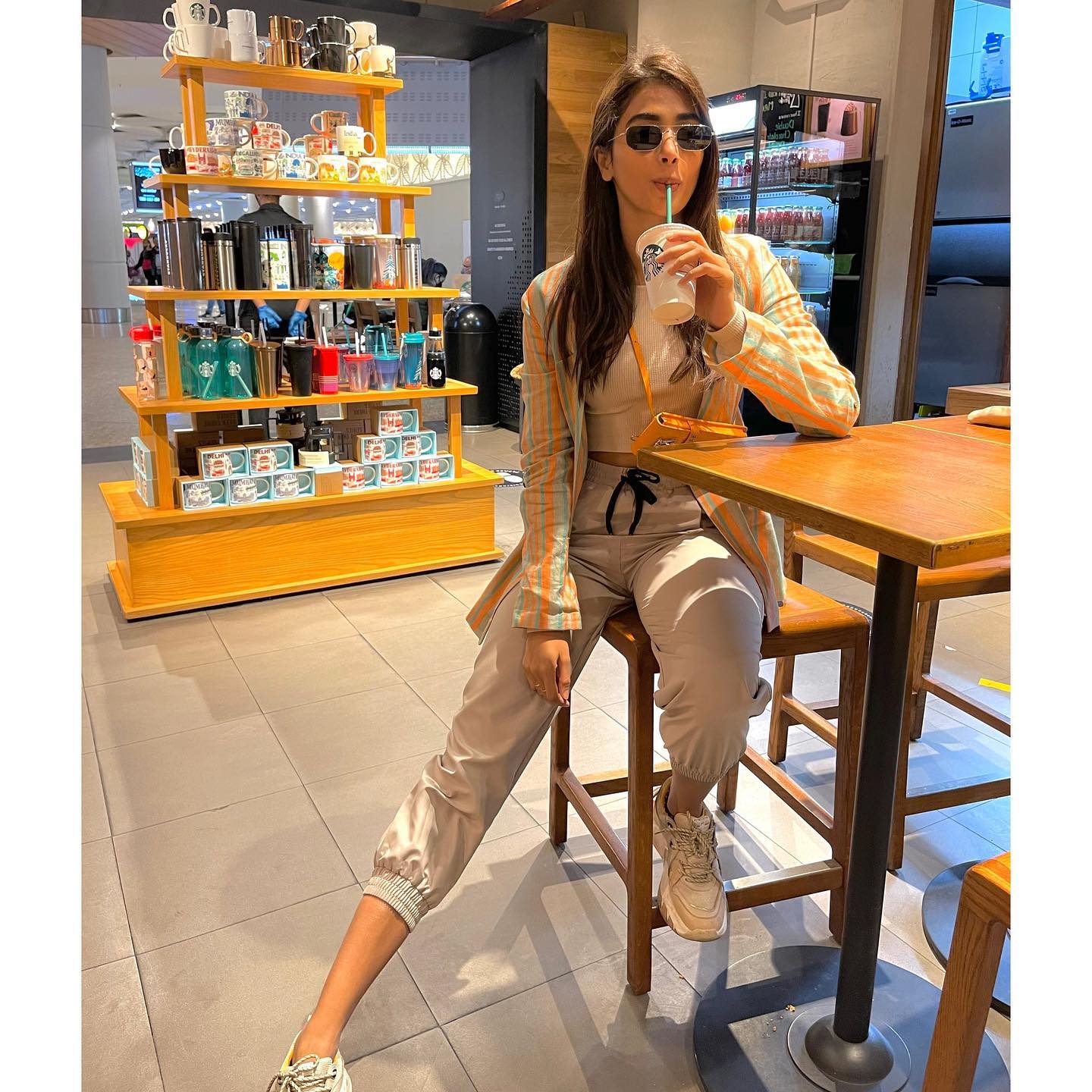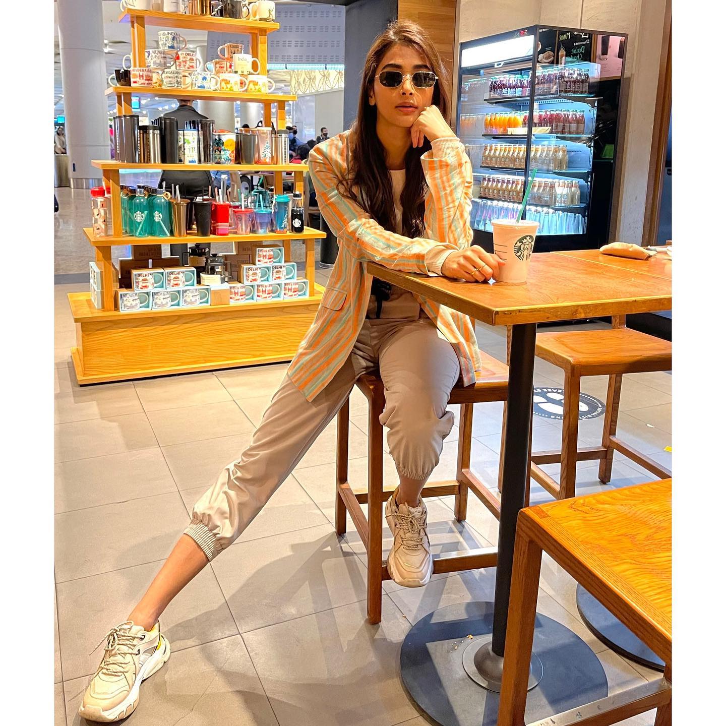pooja stuck to her go-to style of choice—trendy sneakers that tied in perfectly with the sporty vibe. The entire outfit struck a functional-chic balance, ideal for travel yet still photogenic enough to turn heads. Her minimal accessories and natural hair kept the look grounded, while the overall ensemble proved her