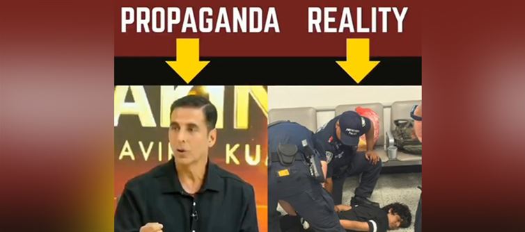 The left side of the image is labeled "PROPAGANDA" and features a video clip of bollywood actor Akshay Kumar. In the video, Kumar is seen on a television show, discussing his experiences with indian passports at international airports. He claims that when indian passports are presented at immigration offices abroad, they are viewed with "a lot of respect." He attributes this respect to the global standing of india under prime minister Narendra Modi's leadership, stating, "You come from the country of Modi." This narrative suggests a positive and respectful treatment of indian nationals due to national pride and international reputation.
