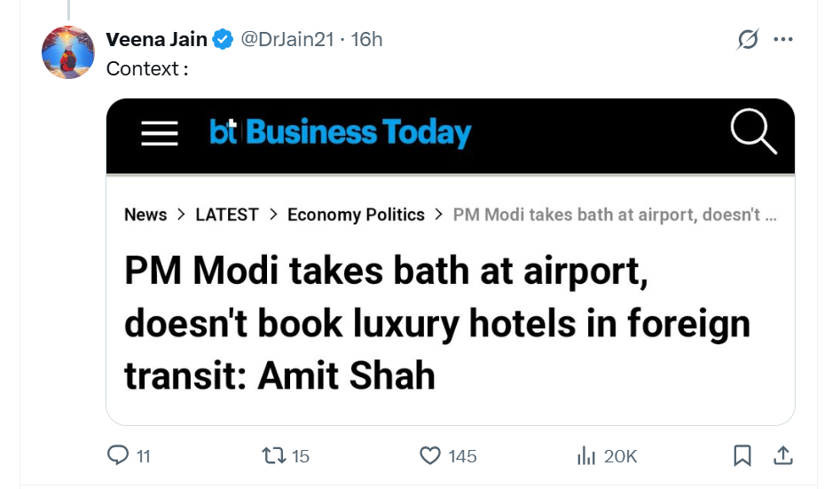 The tweet reads: "People: Why wasn't Modi ji with the World Leaders for the Group photo? Bhakt: Modi ji was taking a Bath in the airport bathroom to save Tax payers money, & there was a water shortage, & he got Late " This is a satirical jab at the narrative often spun by Modi's supporters (referred to as "Bhakts") to explain his absence from high-profile international events. The humor lies in the exaggerated and implausible excuse provided, contrasting sharply with the actual reason for his absence.
