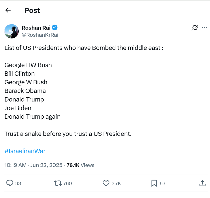 The accompanying statement, "Trust a snake before you trust a US President," reflects a strong sentiment of distrust toward U.S. leadership, implying that these military actions may be perceived as self-serving or duplicitous. This