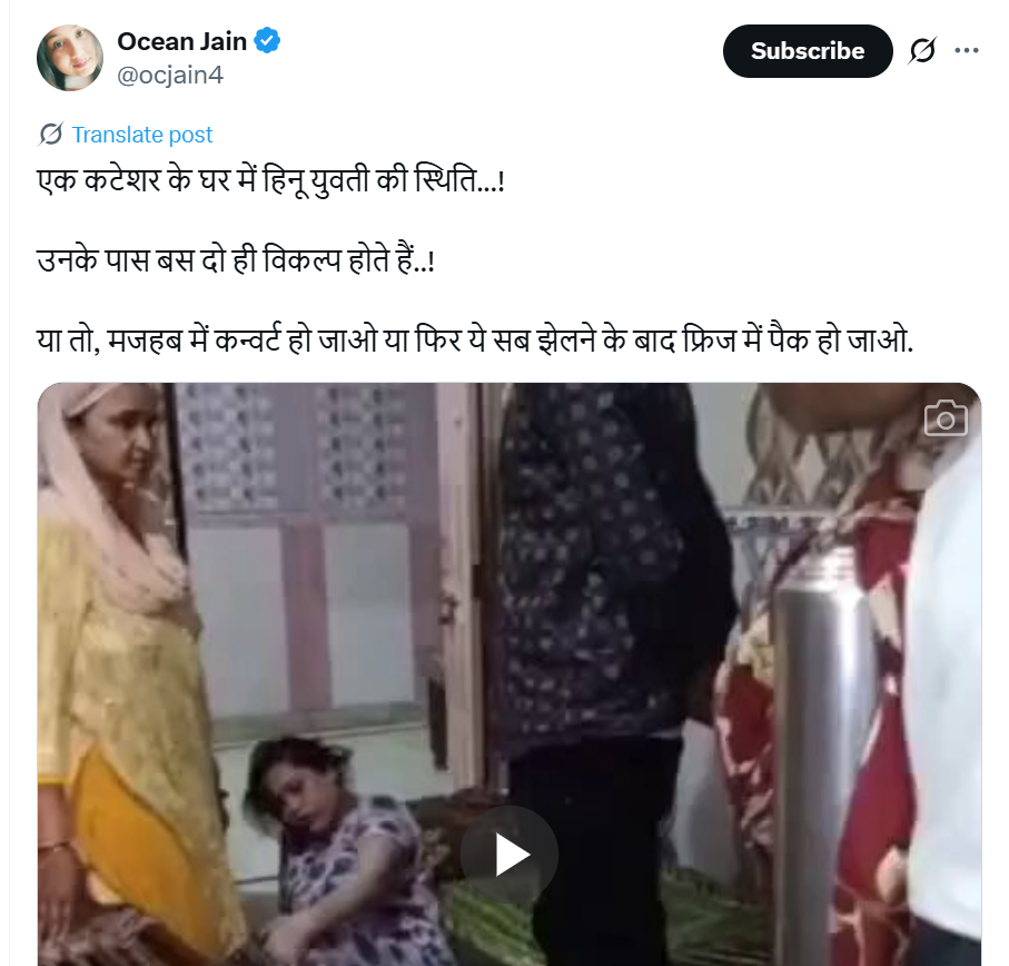 The man, dressed in a dark jacket and sneakers, stands prominently, suggesting a position of authority or aggression. The caption accompanying the video claims that the woman faces a dire choice: either convert to another religion or endure severe consequences, including potential violence leading to death ("or else, after enduring all this, end up packed in a fridge").