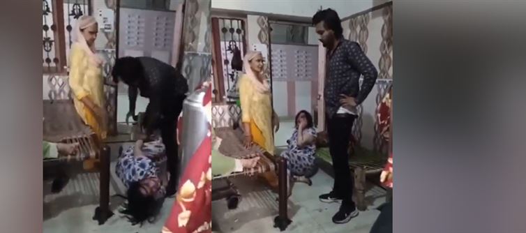 The video, captured inside a room with patterned walls and simple furnishings, shows the woman appearing disoriented or injured, with another woman in traditional attire nearby, possibly observing or intervening.