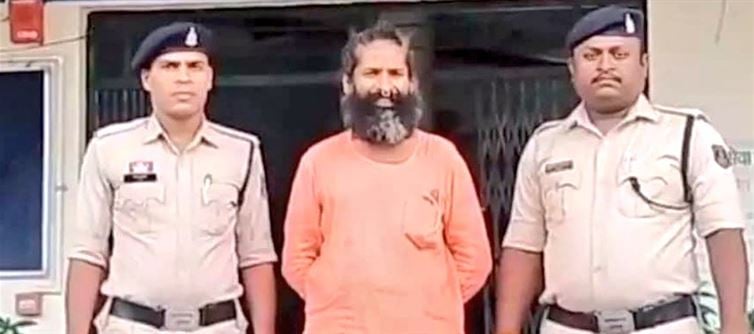 Dressed in traditional saffron robes and sporting a long beard, the baba presents a stark contrast to the uniformed officers on either side, who stand with stern expressions. His hands are not visibly restrained, but the presence of the officers suggests he is in custody.