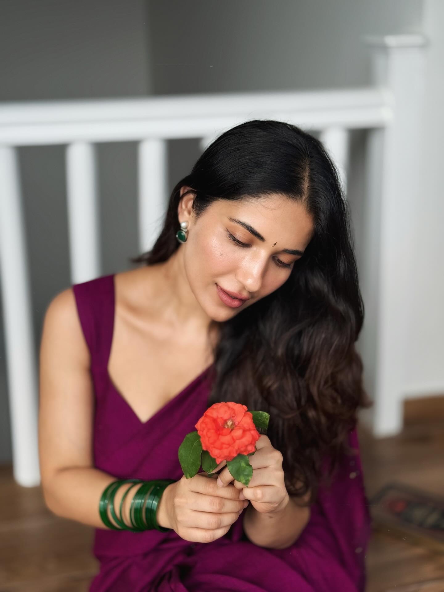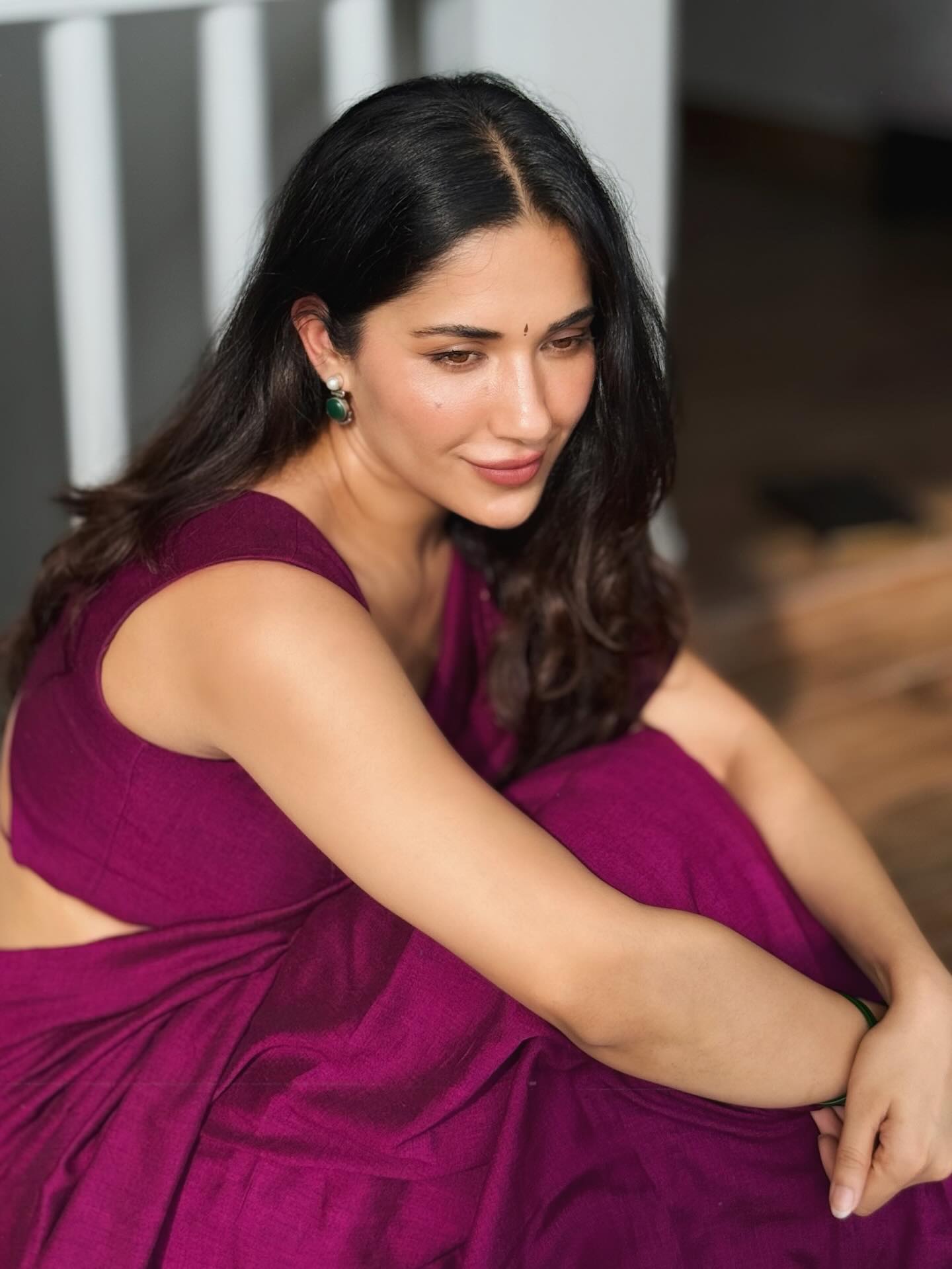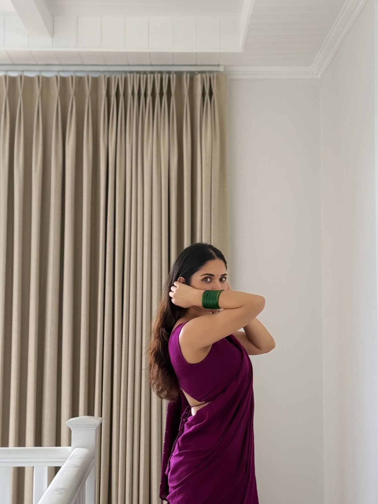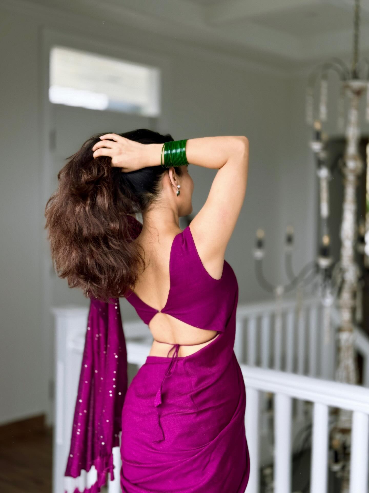 fashion choices, has taken a refreshingly unexpected turn with her latest photoshoot — and the internet can’t stop talking about it. Swapping out her usual bikini looks and high-fashion poses, Ruhani stepped into a plain purple saree, accompanied by nothing more than green bangles and delicate earrings.