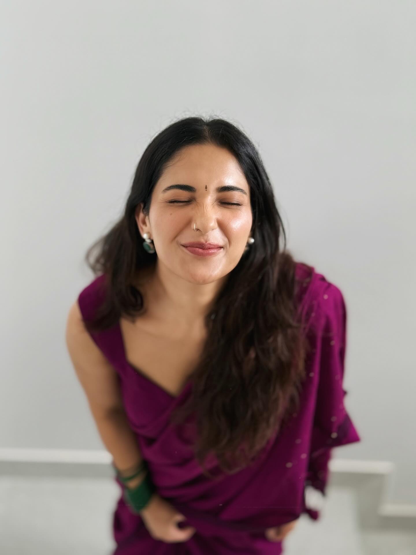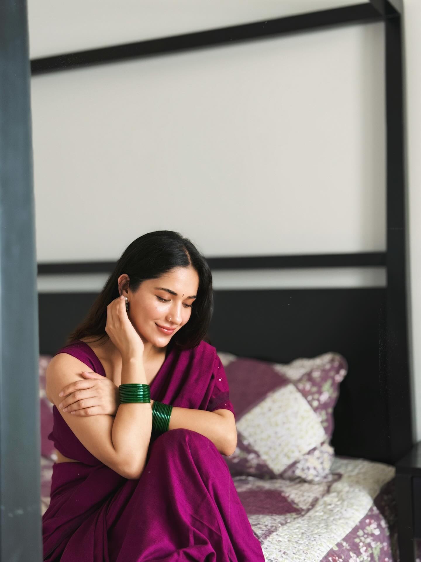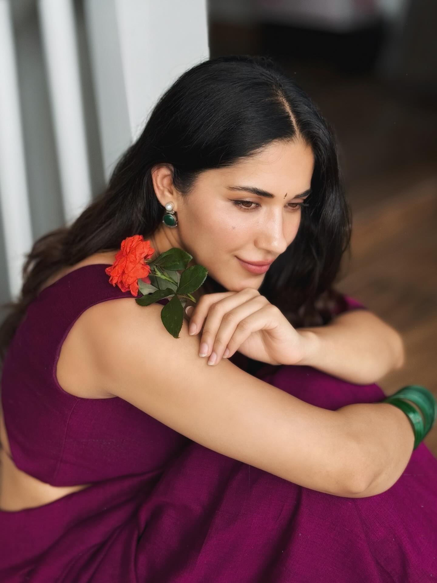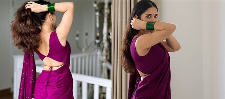 fashion choices, has taken a refreshingly unexpected turn with her latest photoshoot — and the internet can’t stop talking about it. Swapping out her usual bikini looks and high-fashion poses, Ruhani stepped into a plain purple saree, accompanied by nothing more than green bangles and delicate earrings.