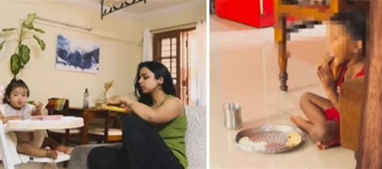 "Remember how our mothers used to leave us the food since they were so busy cleaning the house? We learned to eat as a result. "BLW is simply the same story in a cover that looks so expensive!" Sharma declares in the video. While her infant feeds from a high chair, she is seen in the video sitting on a sofa. The following image, however, shows her domestic worker's three-year-old boy eating roti and kheer while seated on the floor.