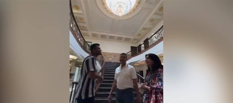 The video begins with an exterior shot of the bungalow, where three individuals are seen conversing. The setting is a well-maintained garden area with a canopy, and the house itself appears grand and modern. Inside, the tour reveals rooms adorned with gold decorations, including furniture, wall accents, and even electrical sockets. The interior design is lavish, featuring high ceilings, ornate moldings, and classic artwork. The video also shows a collection of luxury cars, a cow shelter (Gaushala), and a spacious garden with a dining area near a fountain. The tour includes a grand staircase, multiple bedrooms, and a balcony, all emphasizing the wealth and extravagance of the property.