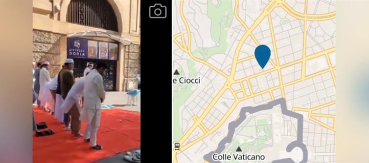 The video, set against the backdrop of a building labeled "Cityplex Doria," a cinema located in Rome, shows a group of men engaged in the Islamic prayer ritual, known as Salah. The men, dressed predominantly in white traditional attire, are seen kneeling and prostrating on red prayer mats laid out on the street. The setting is urban, with the cinema's entrance and surrounding architecture visible, indicating a central location within the city.