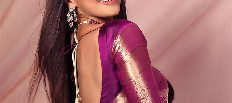 In these elegant portraits, pooja hegde radiates timeless grace in a stunning deep purple Kanjivaram silk saree adorned with intricate golden zari work. The fabric glows with traditional motifs and luxurious texture, beautifully catching the light with every fold. The blouse, featuring a rich gold weave and a deep-cut back tied with delicate tassels, enhances the traditional charm with a modern twist. Her styling is flawlessly balanced — traditional jhumkas and a stone-studded choker elevate her ethnic look, while the matching purple bangles and subtle makeup complement her glowing complexion.