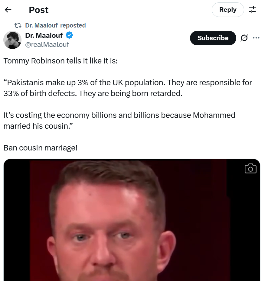 In the video, Tommy Robinson asserts that 76% of Pakistanis in Bradford marry their first cousins. He further claims that Pakistanis, who make up 3% of the UK population, are responsible for 33% of birth defects. Robinson argues that this practice is costing the UK billions due to the associated healthcare and economic burdens, attributing the issue to historical practices within Islam, specifically referencing the Prophet Muhammad's marriage to his cousin. He calls for a ban on cousin marriage in Great Britain, labeling it as never having been right and necessitating an end.