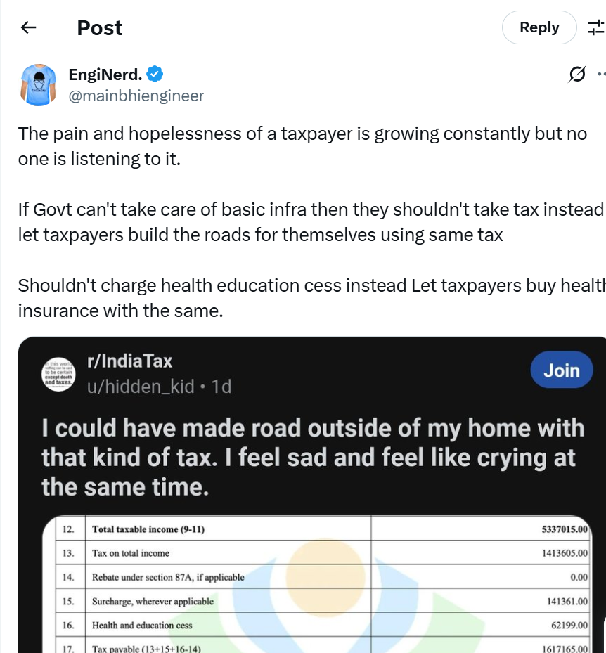 The taxpayer’s cry reflects a broader challenge in India’s taxation and infrastructure development system. Despite significant tax collections—projected to fund national highways and public services—the Comptroller and Auditor General has noted procedural inefficiencies and inadequate resources, such as insufficient ambulances and patrol vehicles on national highways. The post suggests a need for reforms, such as simplifying tax structures, ensuring targeted spending on infrastructure, and enhancing local governance to address community-specific needs like roads. It also raises questions about the effectiveness of cesses and the equitable distribution of public funds.