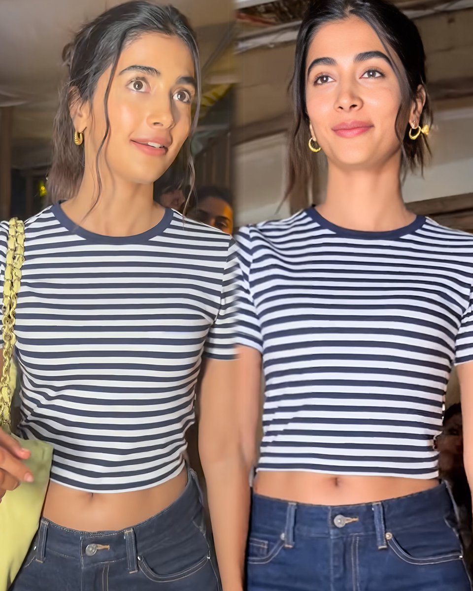 Pooja Hegde’s recent outing in Bandra turned heads as she embraced a chic yet effortless street-style look that highlighted her sartorial sensibilities. Her choice of a navy blue and white striped crop top not only showcased her toned midriff but also exuded a playful charm with its bold, horizontal lines. The crop top’s snug fit and simple design offered a classic aesthetic, subtly nodding to nautical influences while still maintaining a modern, urban flair. By baring her midriff,