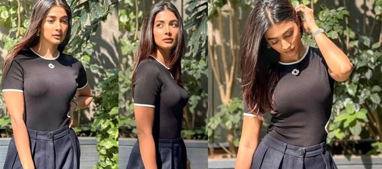 Pooja Hegde exudes elegance and modern sophistication, effortlessly blending minimalism with high fashion. Dressed in a fitted black top with subtle white detailing along the collar and sleeves, she showcases a clean, chic aesthetic that highlights her graceful frame. The small white floral motif near the neckline