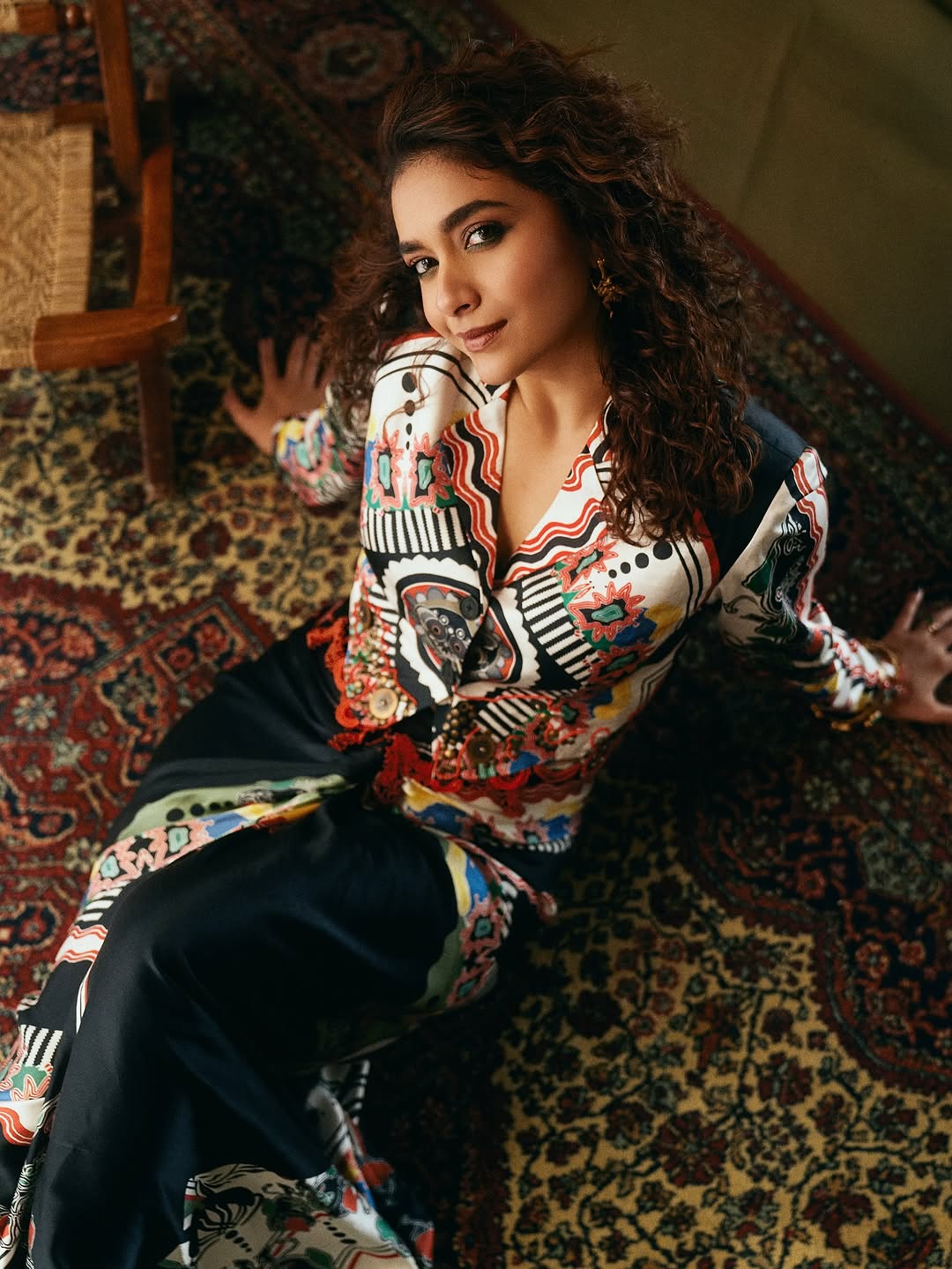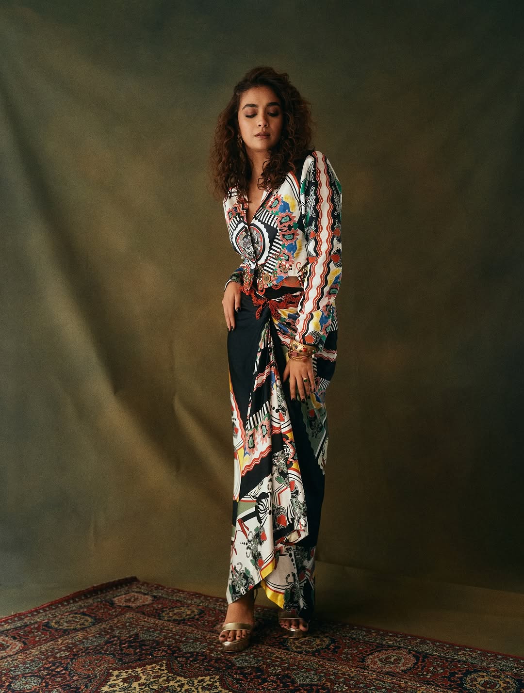 Keerthy suresh showcases a vibrant and free-spirited fashion aesthetic, blending bold prints with elegant styling. The outfit is a captivating fusion of contemporary design and traditional artistry, featuring a multi-patterned ensemble in rich tones of black, red, yellow, white, and green. Each panel of the fabric tells a different story—zigzags, florals, waves, and abstract motifs all harmoniously brought together. Keerthy suresh stands tall with her eyes closed, exuding confidence and grace. Her curly hair frames her face beautifully, complementing the drama of the outfit. The top is structured with a knotted waist and flared bottom, flowing seamlessly into a skirt-like drape that mimics a saree style. Her metallic heels and stacked bangles enhance the boho-luxe vibe.Keerthy Suresh's looks are candid and joyful moments. Keerthy suresh seated on a rustic chair, radiates charm with a bright smile and expressive eyes. The close-up reveals intricate details of her statement earrings, colorful bracelets, and the fine fabric textures. Keerthy suresh reclines gracefully on a patterned carpet, blending into the earthy and artistic backdrop. Her confident gaze and relaxed posture bring a balance of strength and softness. Altogether, these photos present a celebration of artistic expression, cultural flair, and modern femininity.