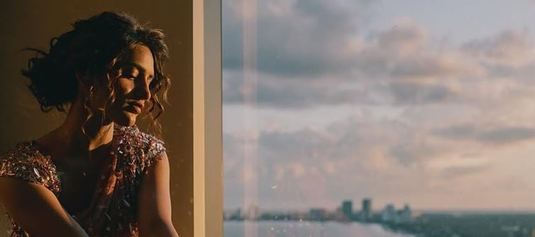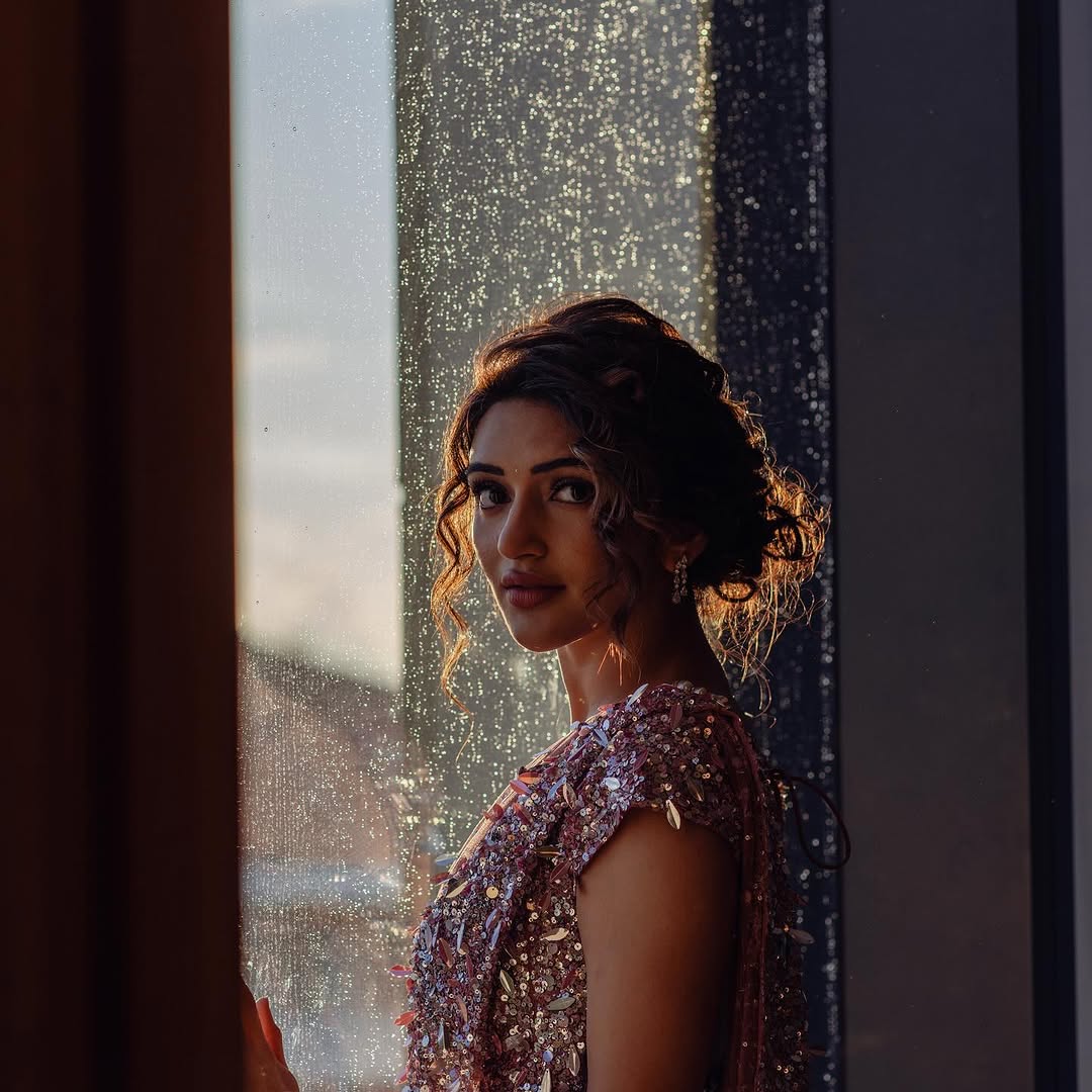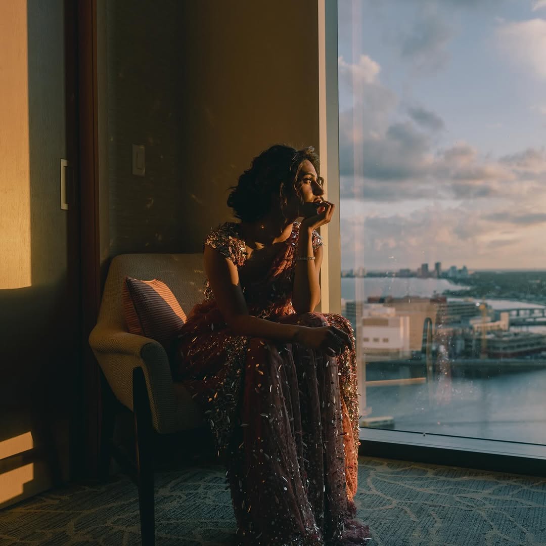 Bathed in the soft, golden embrace of the setting sun, these images capture a serene and contemplative mood. sree Leela dressed in a mesmerizing rose-gold embellished gown, sits by a large glass window overlooking a cityscape and a winding river. Each sequin on her outfit reflects the warm light, adding a magical sparkle that enhances the elegance of the moment. Sree Leela sits peacefully by the window, eyes closed and expression serene, as though lost in thought or in the warmth of a memory. The blend of the dress’s shimmer with the gentle dusk light creates a poetic contrast of glamour and quiet introspection.Sree Leela's photo shows her in a similar pose, this time resting on a chair with her chin propped on her hand, gazing into the horizon. The distant skyline and soft clouds add depth to the visual narrative, symbolizing dreams, nostalgia, or perhaps anticipation. sree Leela stands, facing the camera with a subtle smile and soulful eyes. Her soft curls frame her face beautifully, and the sunlight behind her outlines her figure in a gentle glow. The raindrop-speckled glass adds texture and a hint of melancholy to this powerful portrait. Together, these portraits evoke emotion, beauty, and timeless grace.