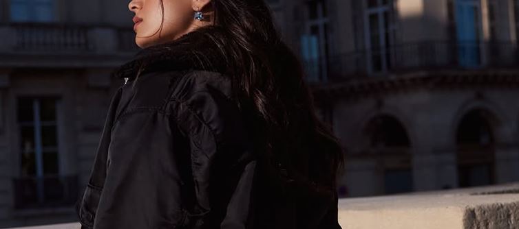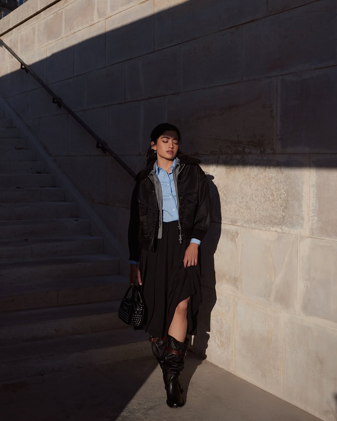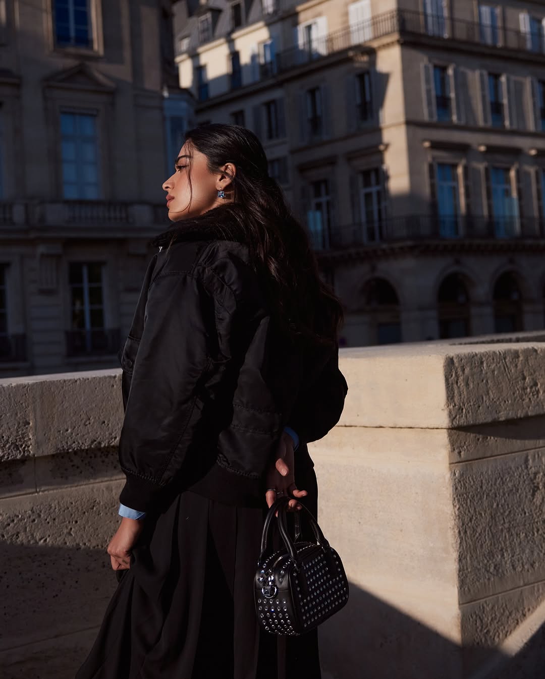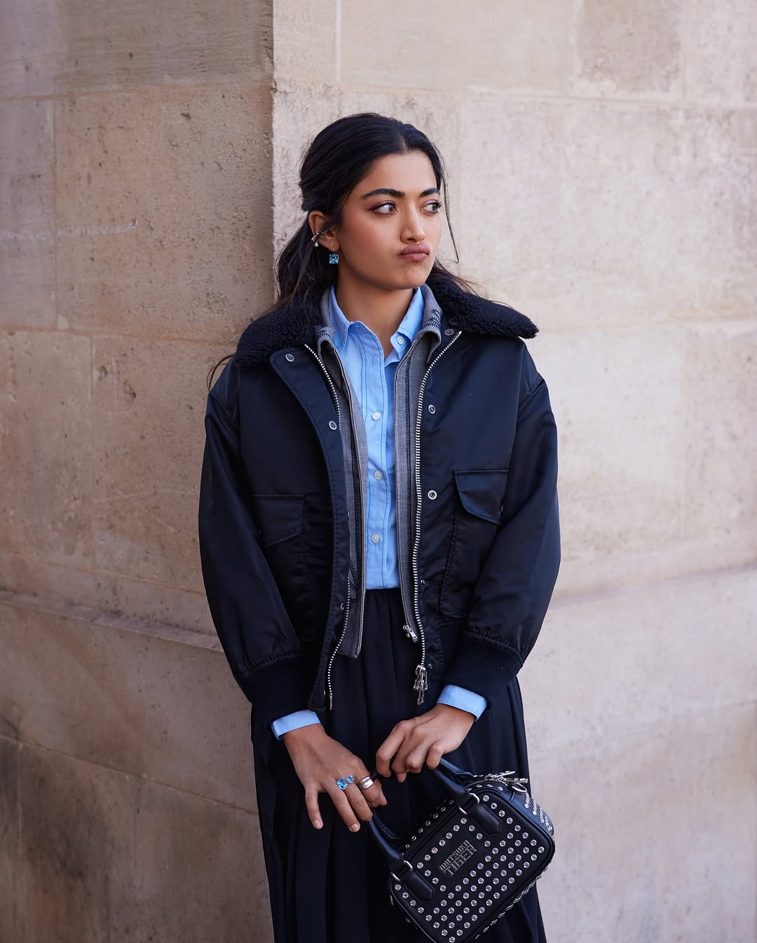 Rashmika stands tall on a stone bridge with a composed side profile, letting the sunlight grace her face. Her long, wavy hair cascades down as she holds a black studded handbag with elegance. The backdrop of heritage buildings adds a timeless european charm.She is in a full-body pose, leaning gently against a textured stone wall, half-shadowed by a staircase. She wears a blue button-down shirt under a cropped black bomber jacket, paired with a flowing asymmetrical black skirt and high boots. The entire look speaks of urban sophistication with a hint of rebellion. She stands against a beige stone wall with a playful pout, softening the otherwise sharp look. Her black jacket, minimal makeup, blue earrings, and rings complement the outfit while the handbag remains a striking accessory throughout.Together, these photos portray a narrative of refined fashion with attitude, blending confidence, elegance, and a touch of playfulness — a modern-day style icon in a city of timeless beauty.