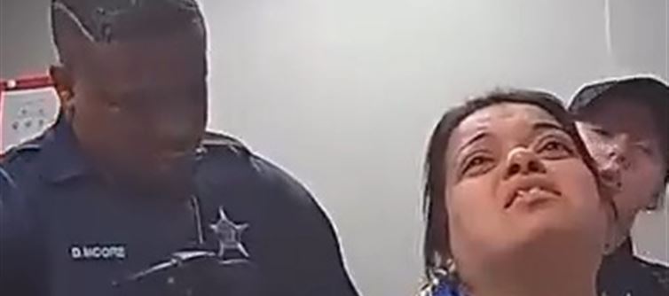The woman repeatedly says, "Please, please don't do this," as officers hold her arms. One officer responds, "Stop! Don't resist, it's not going to go well for you," and clarifies, "When you take things without permission, that is a crime."