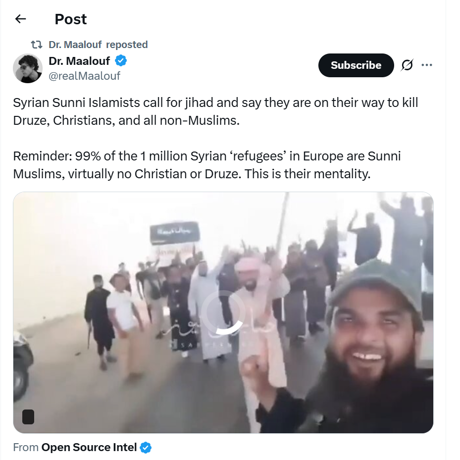 The disturbing calls for jihad by Syrian Sunni Islamist factions — explicitly vowing to kill Druze, Christians, and all non-Muslims — highlight a terrifying ideology that thrives on sectarian hatred and aims to annihilate pluralism. These public declarations are not isolated rants; they reflect a deep-rooted extremist worldview that has taken hold in various jihadist militias since the beginning of the Syrian conflict. For the remaining non-Muslim minorities in Syria, such as the Druze and Christians, this means living in constant fear of ethnic and religious cleansing. These groups are not combatants — they are civilians whose only "crime" is their faith.
