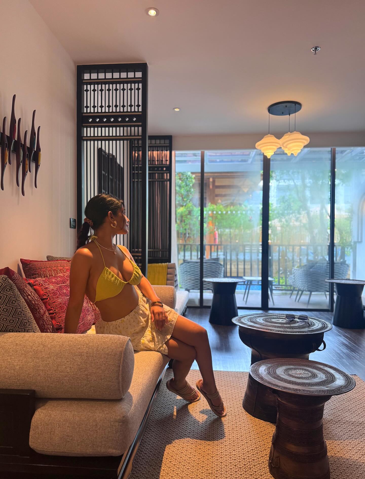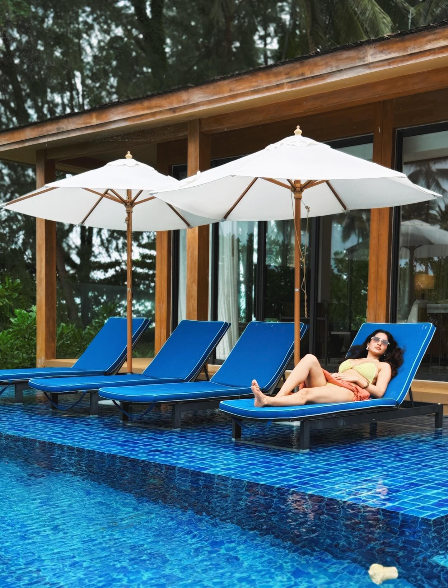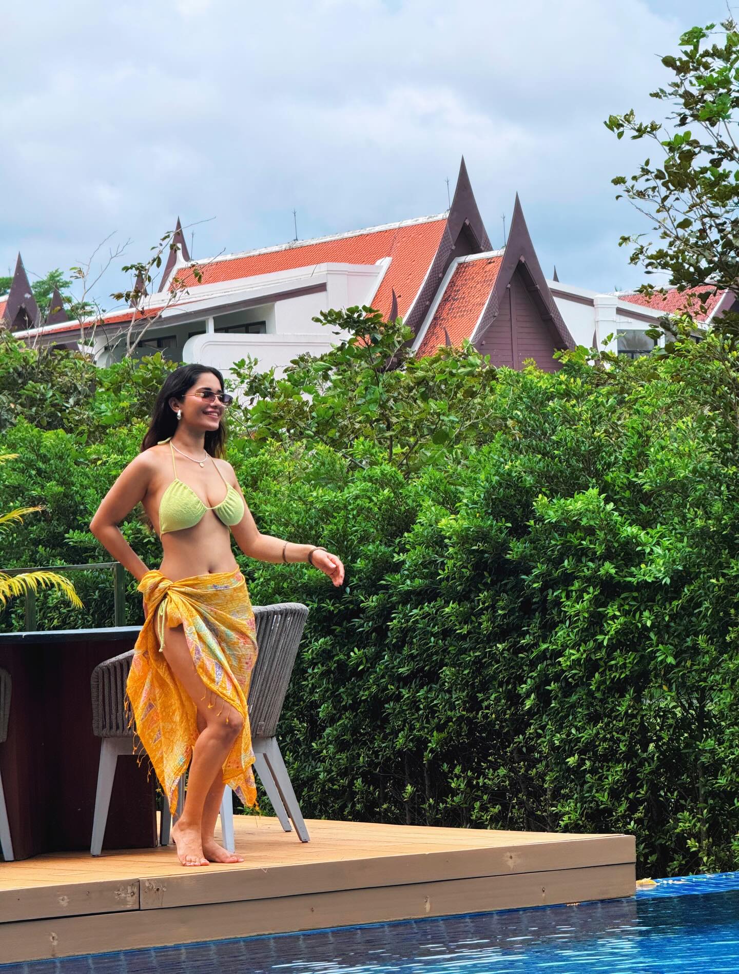 What sets this shoot apart is her complete command over the mood and setting. Whether she’s lounging poolside under the sun's golden rays or casually striding through lush tropical foliage, every frame captures her as a vision of modern-day elegance and fire. Her use of warm, vibrant tones—especially yellows and oranges—creates a visual spectacle that’s both summery and searing. Sunglasses mask her eyes, but not the attitude; there’s a fierce energy pulsing through each click, a mix of calm poise and untamed spirit.
