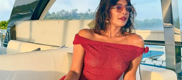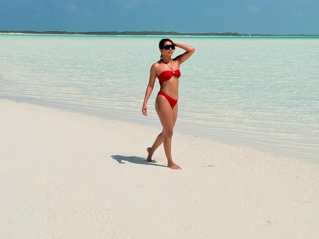 These vibrant images capture a serene and stylish tropical escape. priyanka chopra showcases in a striking red bikini, perfectly complementing the pristine white sands and crystal-clear turquoise waters surrounding her. She exudes confidence and freedom, reclining gracefully on a tiny sandbar in one photo and strolling effortlessly along the beach in the next. Her carefree smile and sun-kissed skin reflect the joy of soaking in nature’s beauty without a worry.