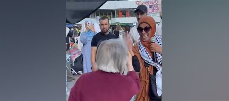 The video, which has been widely circulated on social media, shows the elderly woman attempting to navigate through the crowd, only to be met with aggression from individuals who appear to be part of the protest. The presence of signs reading "Stop the Genocide" and "Palestine" in both english and Arabic indicates the political context of the gathering, but the focus quickly shifts to the personal indignity faced by the woman.