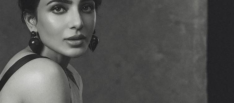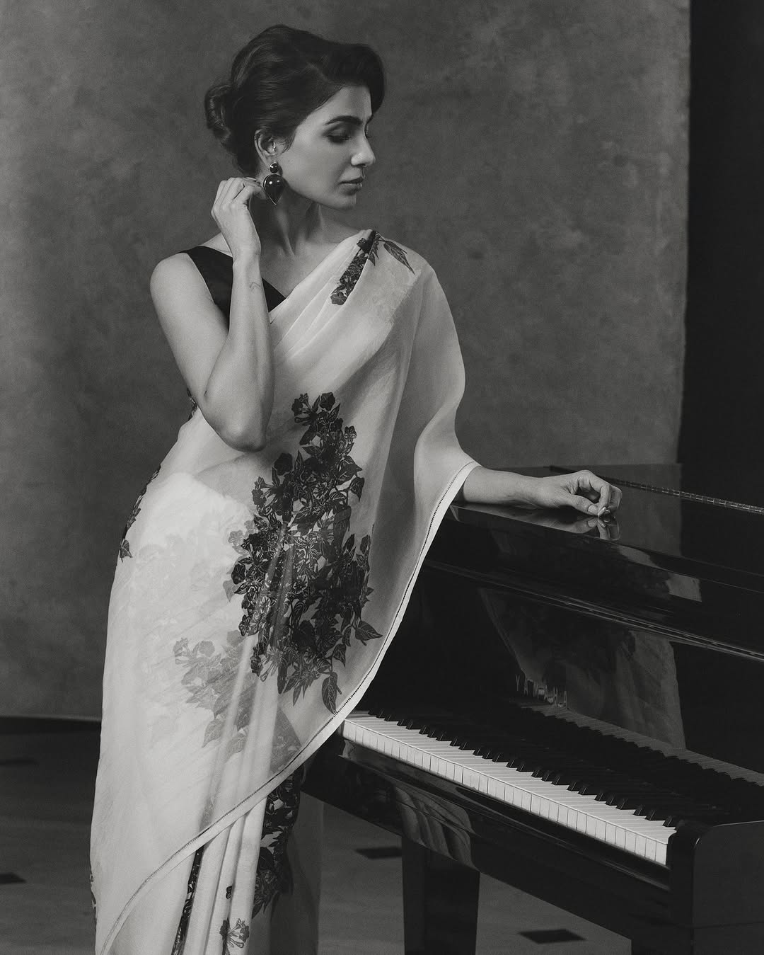 These captivating black-and-white portraits exude grace and sophistication. Samantha, dressed in a sheer, delicately embroidered saree, stands poised beside a grand piano—merging classical fashion with a refined artistic setting. Her look is completed with a sleeveless black blouse and bold, statement earrings that add a touch of modernity to the traditional ensemble. Her soft yet confident gaze directly engages the viewer, her arms resting gently on the piano’s polished surface, creating a mirrored reflection that enhances the drama of the composition. The play of light and shadow brings out the contours of her face and the intricate textures of the fabric.