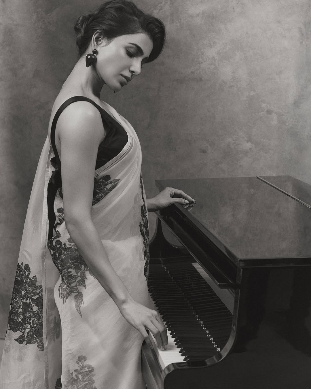 Samantha is seen adjusting her earring, eyes cast downward, evoking a quiet moment of thought or melody. The delicate floral motifs on her saree trail gracefully as she stands against the muted backdrop, echoing old-world charm. In the third frame, she leans gently over the piano keys, her fingers resting lightly, as though about to strike a note. Her serene expression and gentle posture offer a sense of stillness and poetic rhythm, perfectly in tune with the vintage ambiance.Each frame is a tribute to timeless beauty, elegance, and the emotive power of monochrome photography. The fusion of music, fashion, and mood makes these images strikingly artistic and evocative.