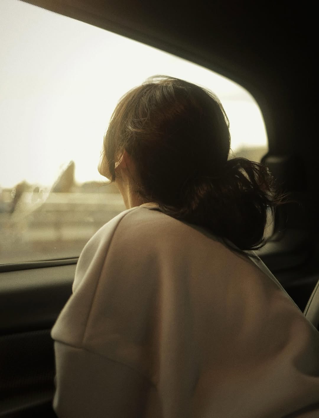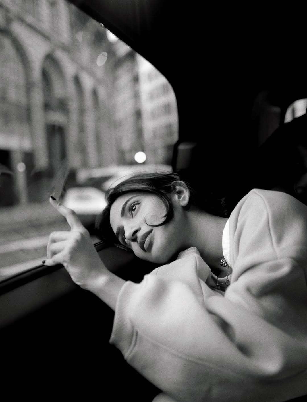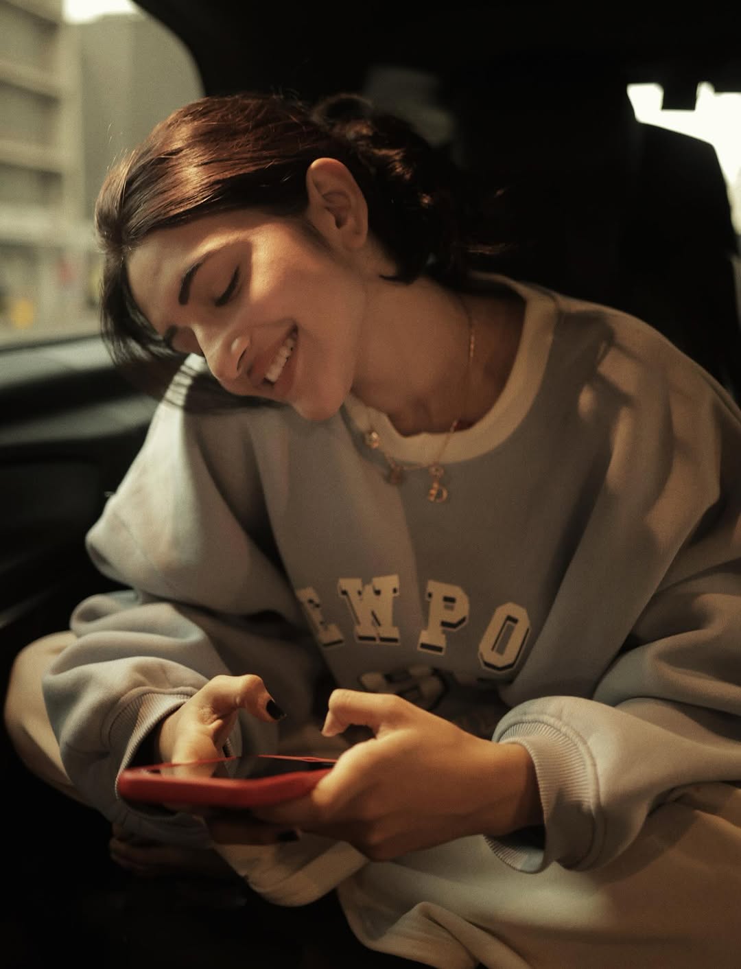 These intimate images capture Sreeleela immersed in soft moments of reflection and serenity during a car ride through the city. In the first black-and-white photo, she leans gently against the window, lost in a dreamy gaze. Her fingers lightly trace the glass, as though interacting with the world rushing by outside. The contrast of city architecture and her stillness creates a timeless, cinematic feel. Her image shifts to warm tones and an atmospheric glow. Shot from behind, it shows her quietly observing the fading daylight through the car window. The blurred cityscape outside, paired with her slightly messy bun and cozy attire, evokes a quiet longing — a moment of solitude amidst motion.Sreeleela radiates joy and calm. She’s smiling at her phone, head tilted in a relaxed gesture, wrapped in a comfy oversized sweatshirt that spells “EMPO.” Her happiness feels spontaneous and genuine, suggesting a message, a memory, or a laugh shared from afar. Together, these images tell a story not through action, but through emotion. They are about being present in transition — emotionally grounded while physically moving. There’s no rush here, just the simple beauty of stillness, warmth, and thoughtfulness during a journey that could be anywhere.