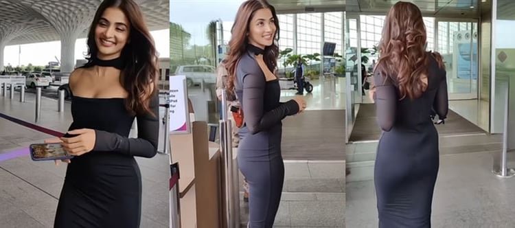 The attire, complemented by her radiant smile and flowing hair, highlights her status as a fashion icon, drawing attention as she navigates the terminal with a smartphone in hand. The architectural backdrop, characterized by a distinctive honeycomb-patterned ceiling and sleek columns, suggests a setting like the Chhatrapati shivaji Maharaj international airport in Mumbai, adding a layer of urban glamour to her appearance.The image captures Hegde in a candid moment, seemingly engaged with her phone, which adds a relatable touch to her celebrity persona. Her choice of a minimalist yet bold outfit underscores her ability to make a statement without overwhelming accessories, a testament to her evolving fashion sense that has garnered admiration across her fan base and the entertainment industry. The background reveals a typical airport scene—taxis, travelers, and signage—providing a contrast that emphasizes her poised demeanor amidst the everyday chaos.