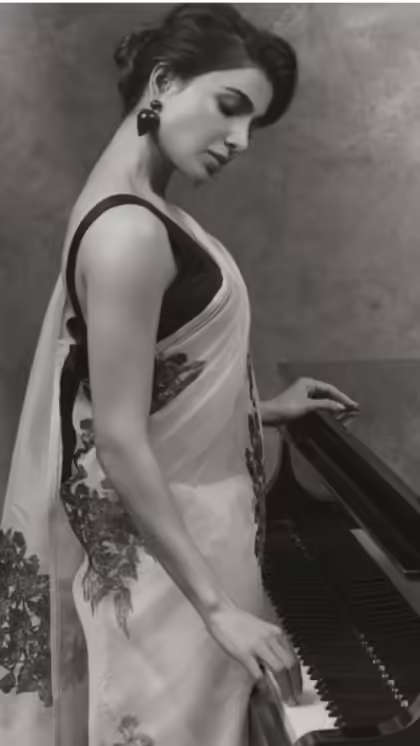 audience in addition to being aesthetically pleasing. Her ability to glow in a peach saree or posture elegantly beside a piano while wearing a traditional black-and-white saree. Her change in style is indicative of a larger cultural movement in which the saree is no longer restricted to traditional contexts but is praised as a multipurpose item of clothing appropriate for a range of events.