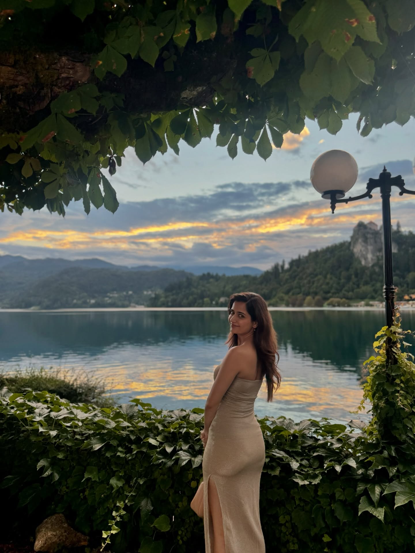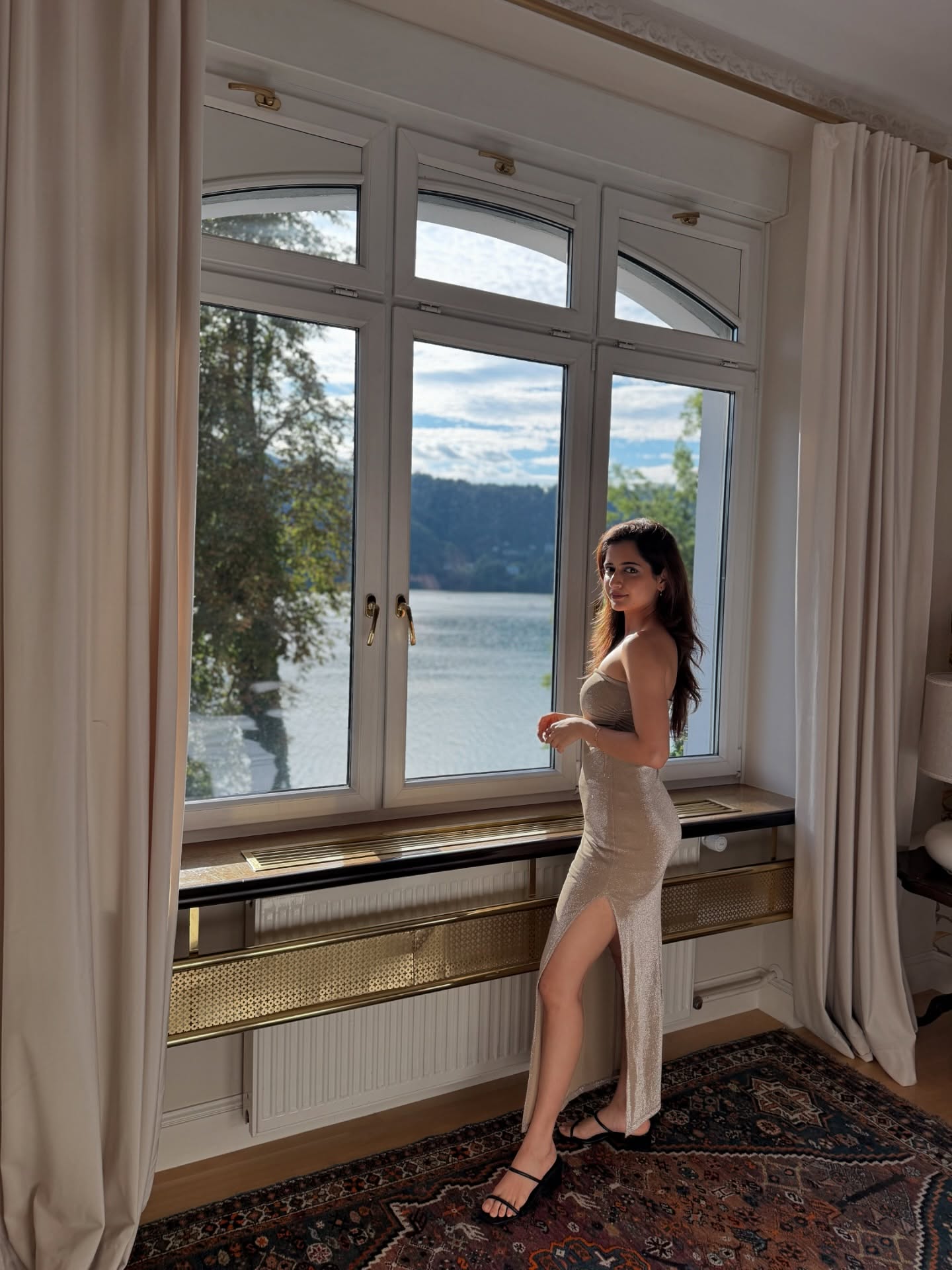 The carefully chosen outfit perfectly complemented her graceful persona. The gown’s soft sheen caught the natural light beautifully, while the daring slit added a subtle hint of boldness to her otherwise understated look. Standing near a spacious balcony framed by large, ornate windows, Ashika’s presence was magnetic. She paired the ensemble with sleek black heels, striking a balance between chic minimalism and high-fashion flair. Her decision to go without jewellery allowed the outfit’s design and her natural beauty to take centre stage, proving that sometimes, less truly is more.